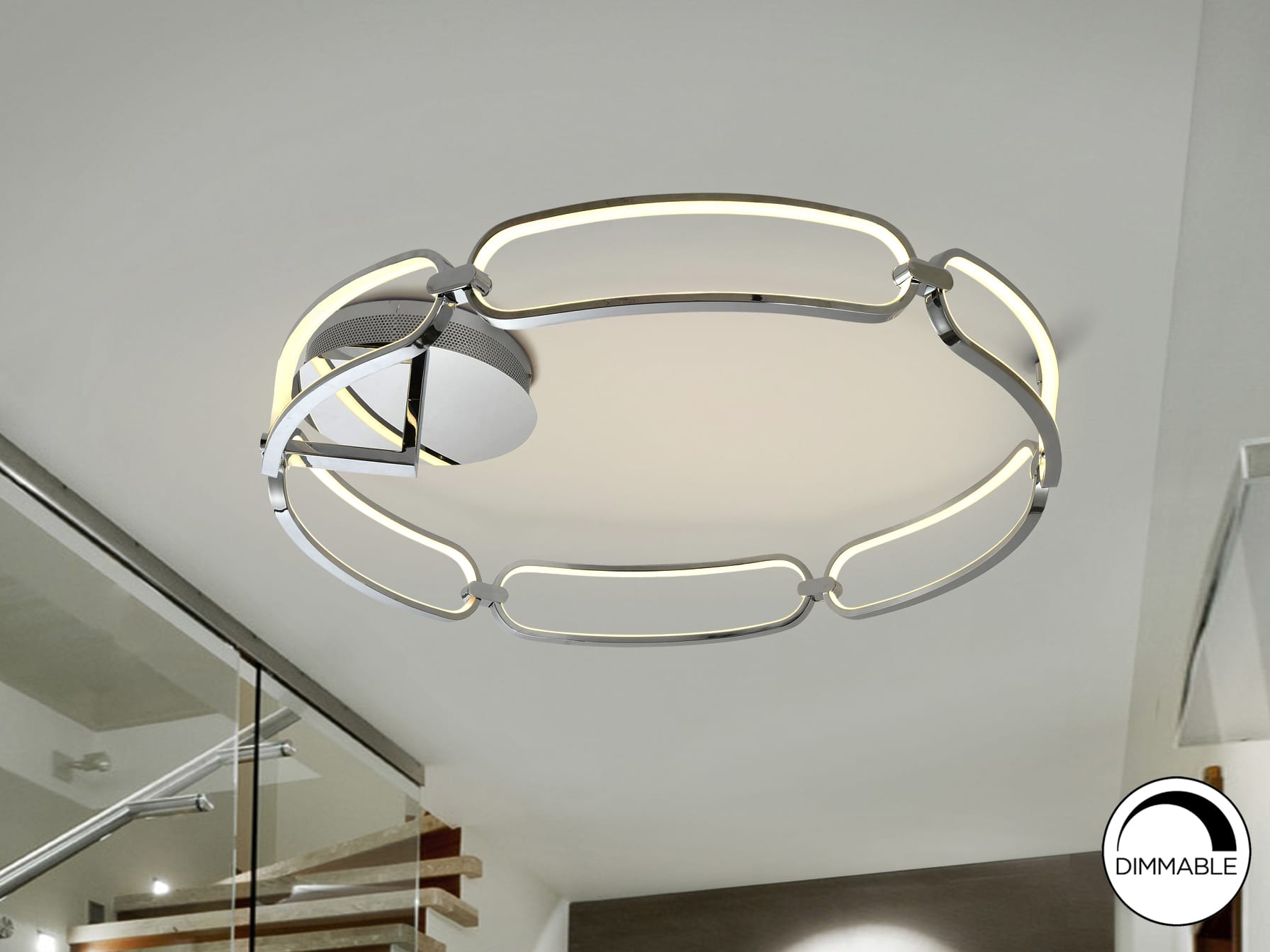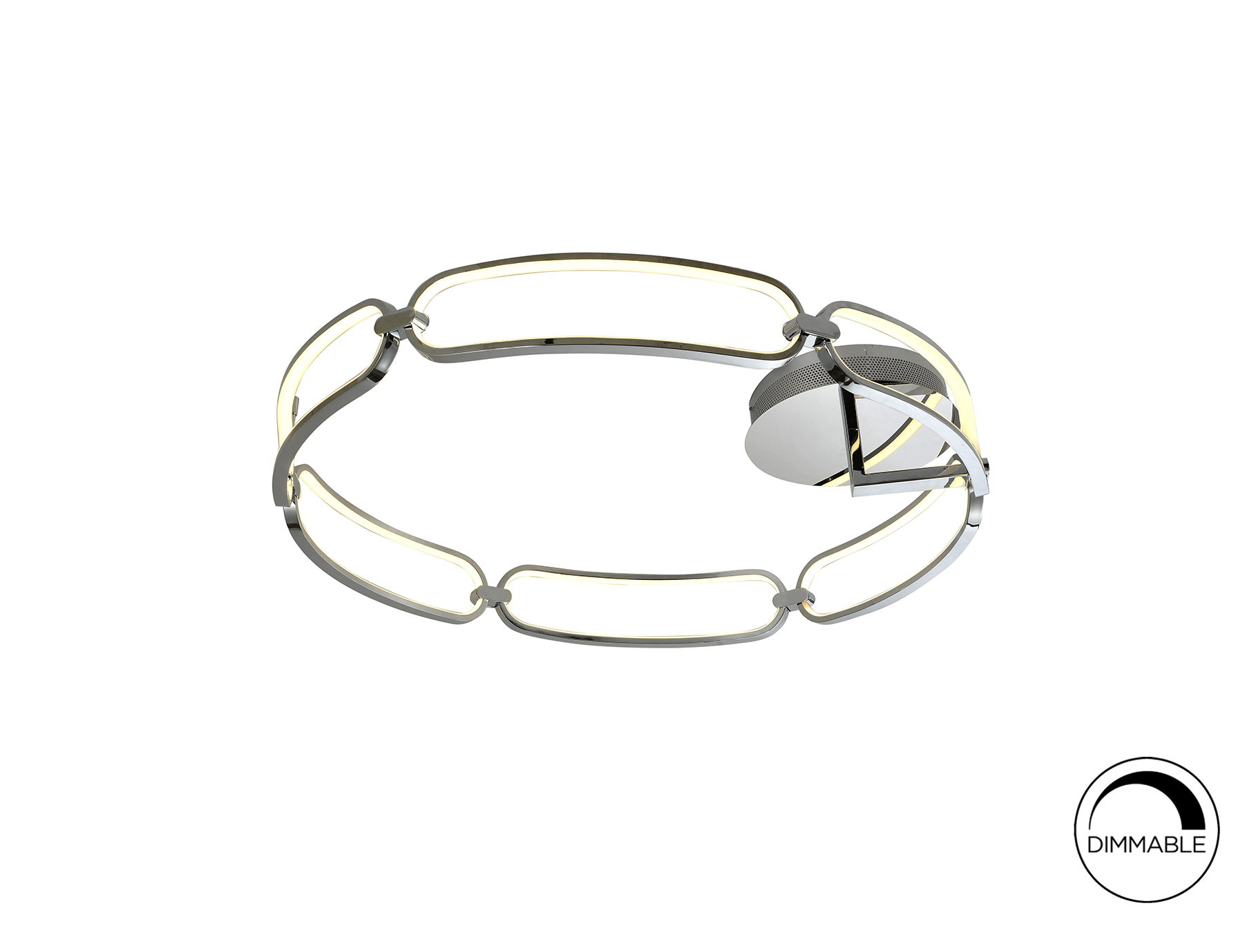 Plafón de techo LED grande, realizado en aluminio acabado cromo. Difusores de silicona opal. 65W LED, 5.850 lm, 3.000 K.
