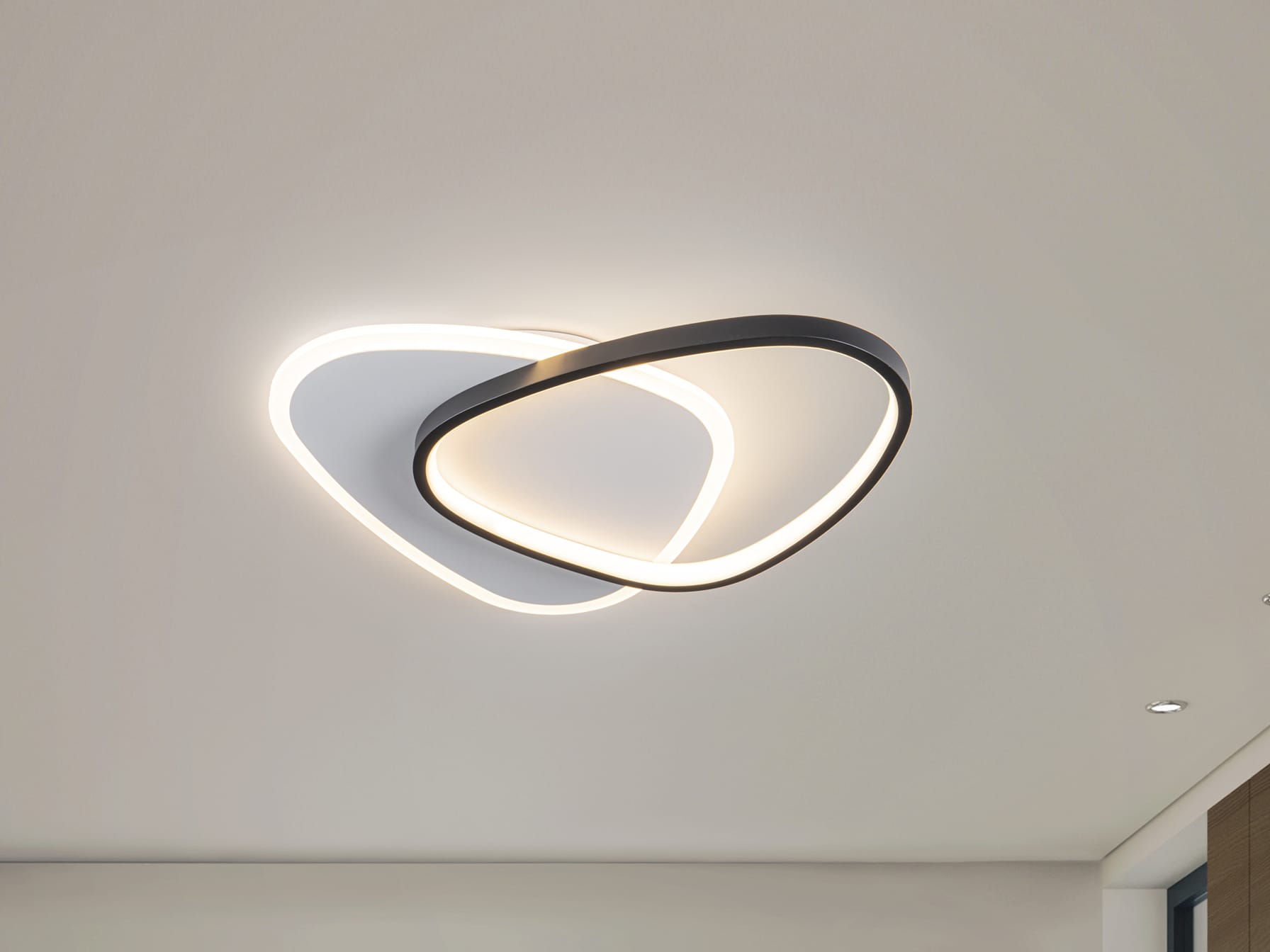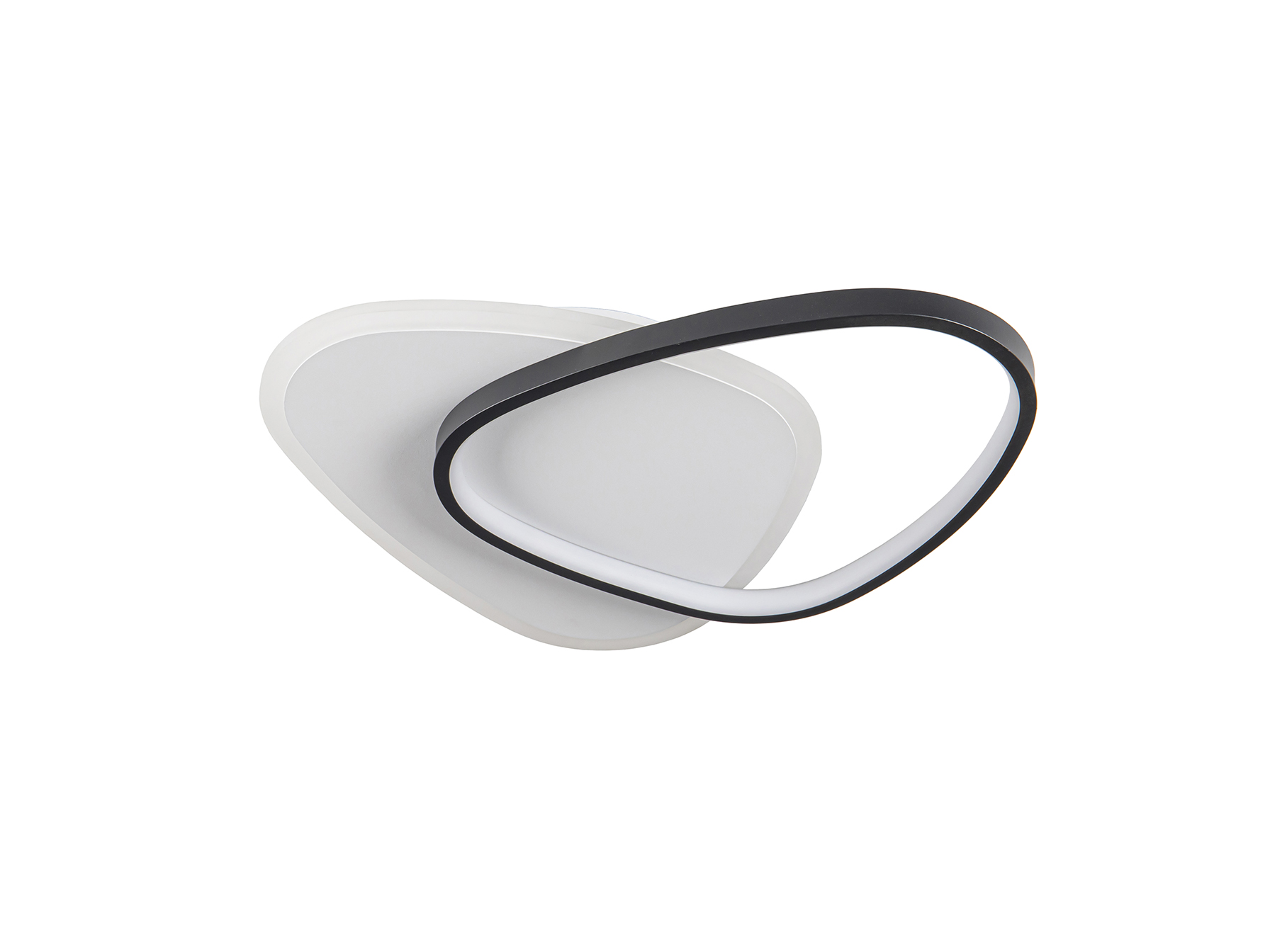 Plafón de techo o aplique de pared, realizado en metal acabado en blanco y negro mate. Difusor de acrílico opal. 28W, 3024lm, 3.000K