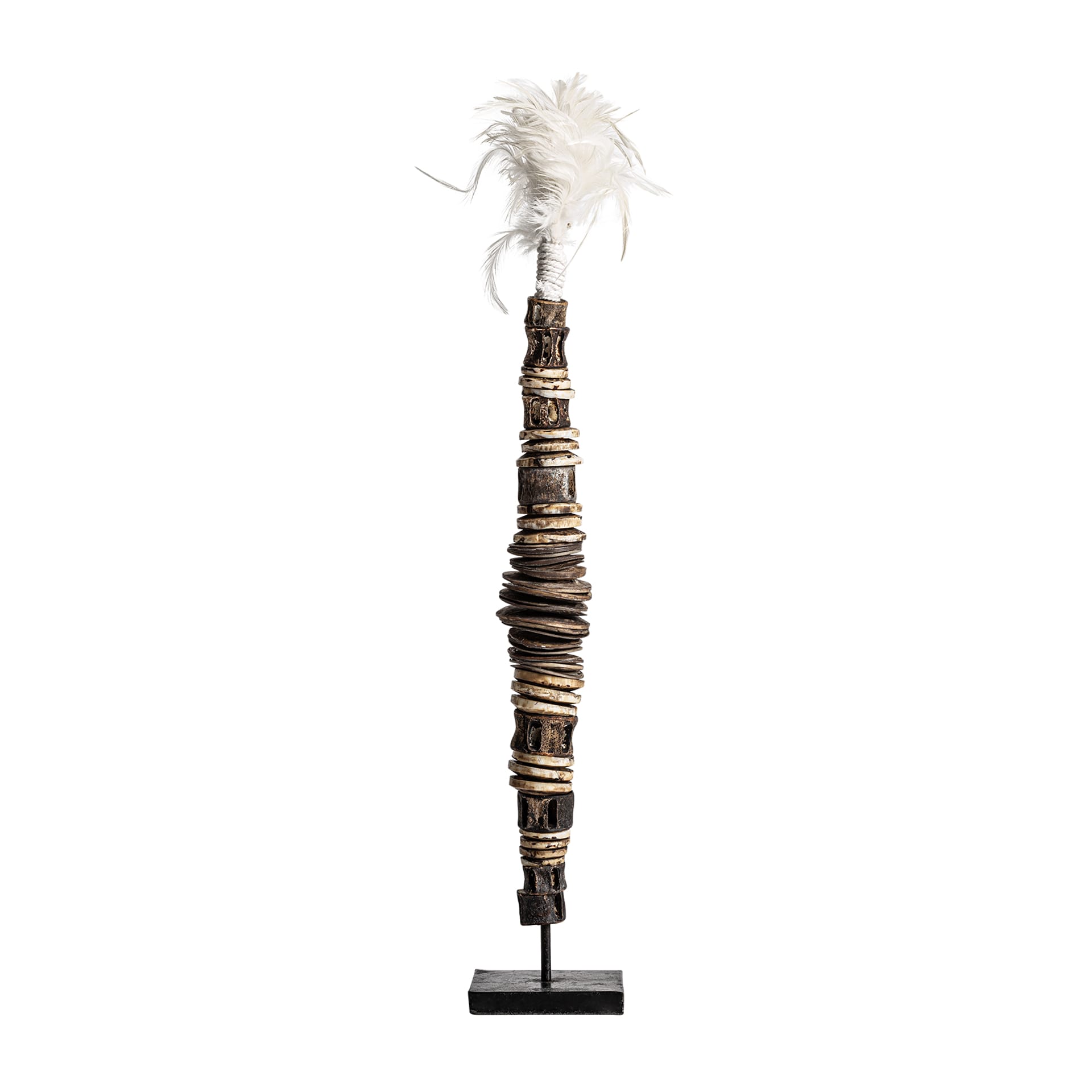 Figura Decorativa De Estilo étnico, Fabricado En Hierro En Color Negro, Combinado Con Concha En Color Tonos En Marrón. Dimensiones: 10 x 10 x 57 cm