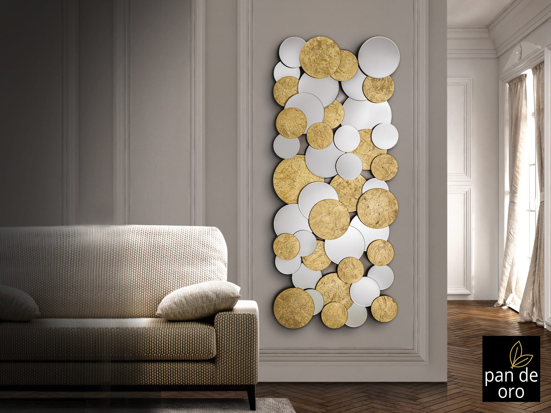 La combinación de círculos de diferentes tamaños en espejo y acabado en pan de oro crea una composición dinámica y moderna, aportando profundidad y textura a la pared.