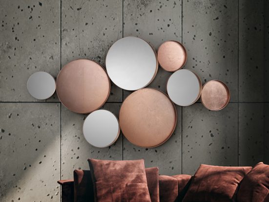 Espejo formado por aros de metal en acabado oro rosa, interiores con discos de espejo o cristal con fondo en PAN DE ORO ROSA. Preparado para colgar en posición horizontal o vertical.