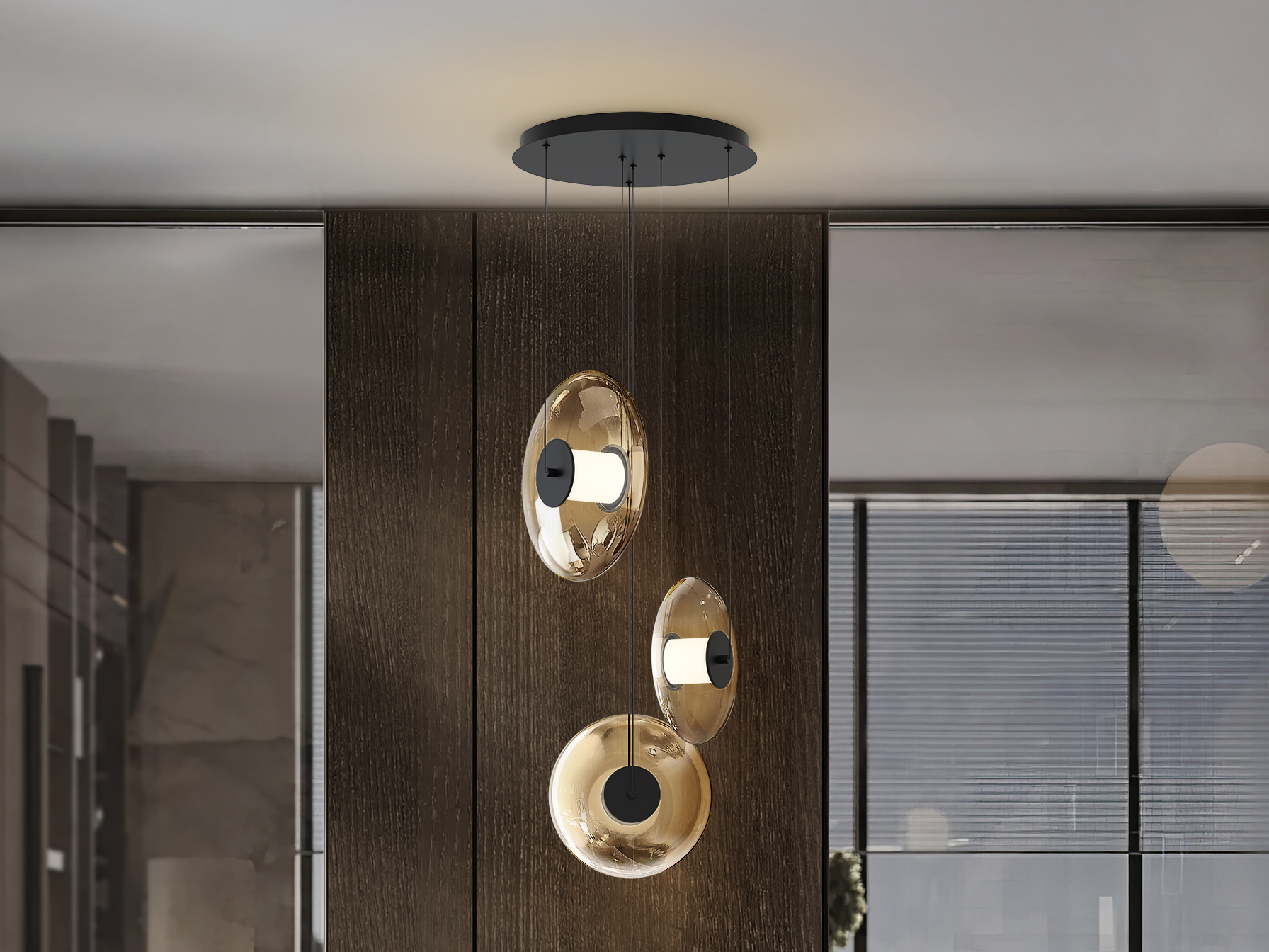 Lámpara realizada en metal acabado negro. 3 Tulipas de cristal ambar. Regulable en altura. 44W LED, 3.000 K, 2640 lm.