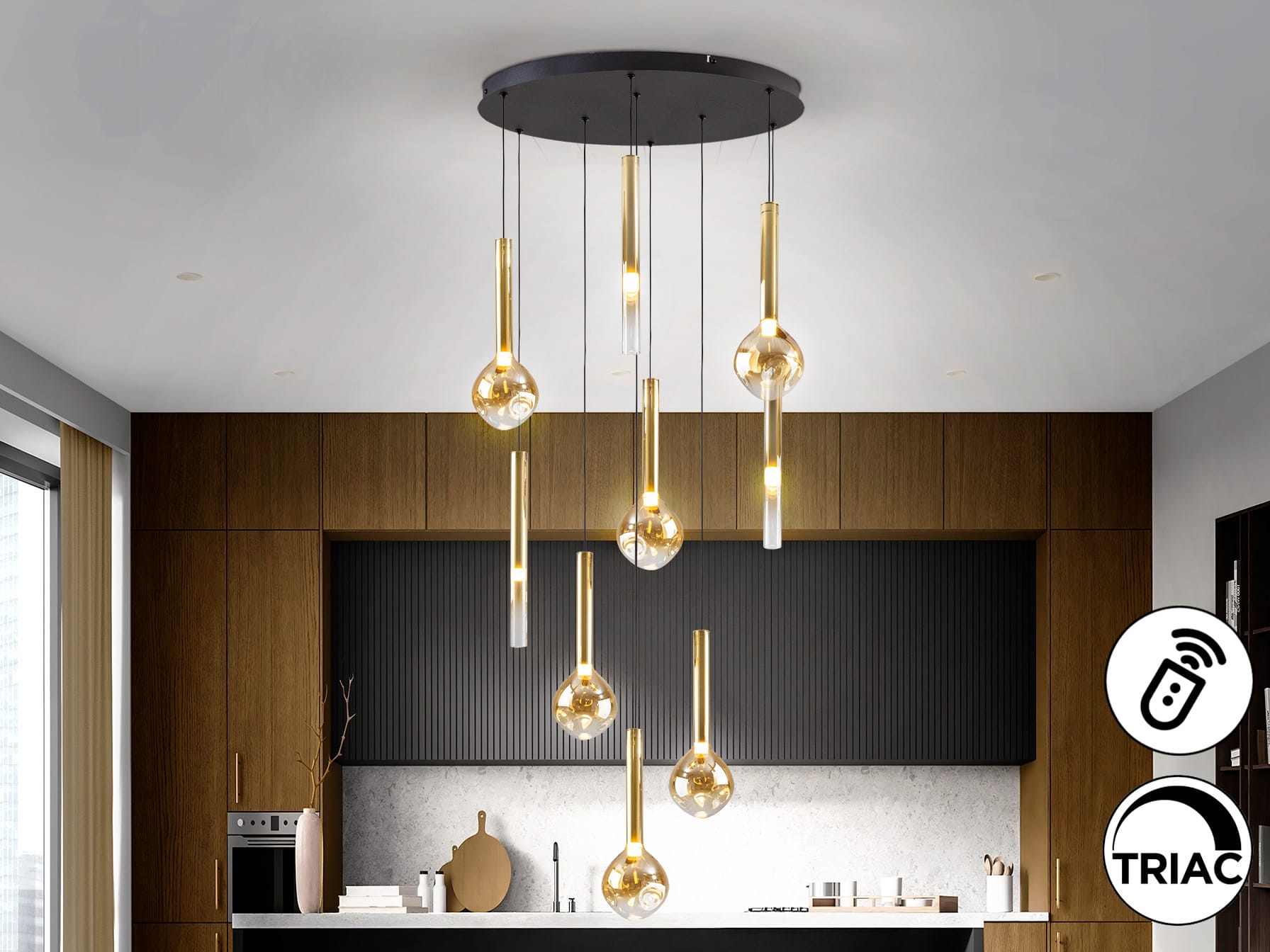 Lámpara realizada en metal acabado negro mate y dorado. 9 Tulipas de cristal ambar degradado a tranparente. Regulable en altura. 36W LED, 3.000 K. 2.160 lm. DIMABLE. Incluye mando a distancia.