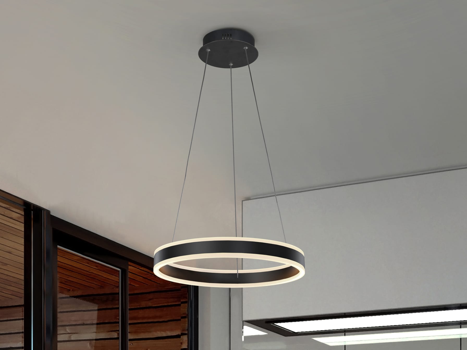 Lámpara realizada en metal y aluminio, acabado negro mate. Aro con difusor de acrílico opal. Altura regulable. 55W LED. 3.000K. 3.300 lm