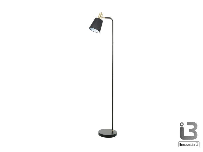 Lámpara de pie realizada en metal acabado negro mate y detalles en latón satinado. Pantalla textil negra con inclinación regulable. 1 E27