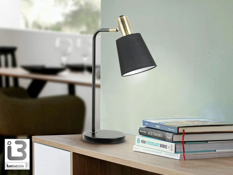 Lámpara de sobremesa realizada en metal acabado negro mate y detalles en latón satinado. Pantalla textil negra con inclinación regulable. 1 E27