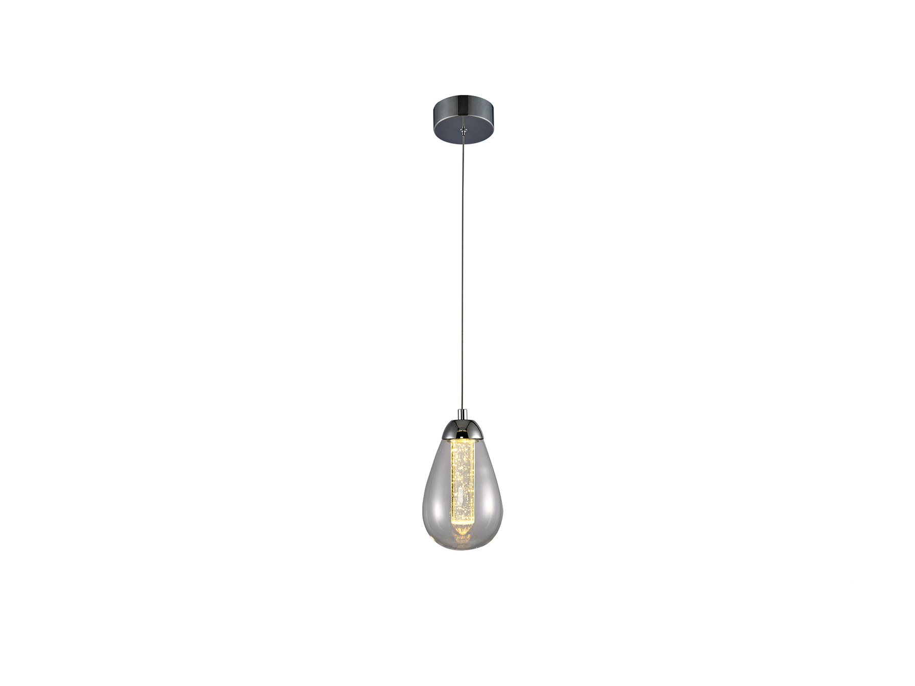 Lámpara de 1 luz LED, realizada en metal acabado cromo. Doble tulipa, exterior con forma de pera realizada en cristal transparente e interior de barra maciza con burbujas decorativas. Regulable en altura. 5W LED. 450lm 3.000 K.