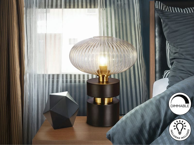 Lámpara sobremesa de 1 luz realizada en metal acabado negro mate, con detalles de latón satinado. Tulipa de cristal moldeado transparente.