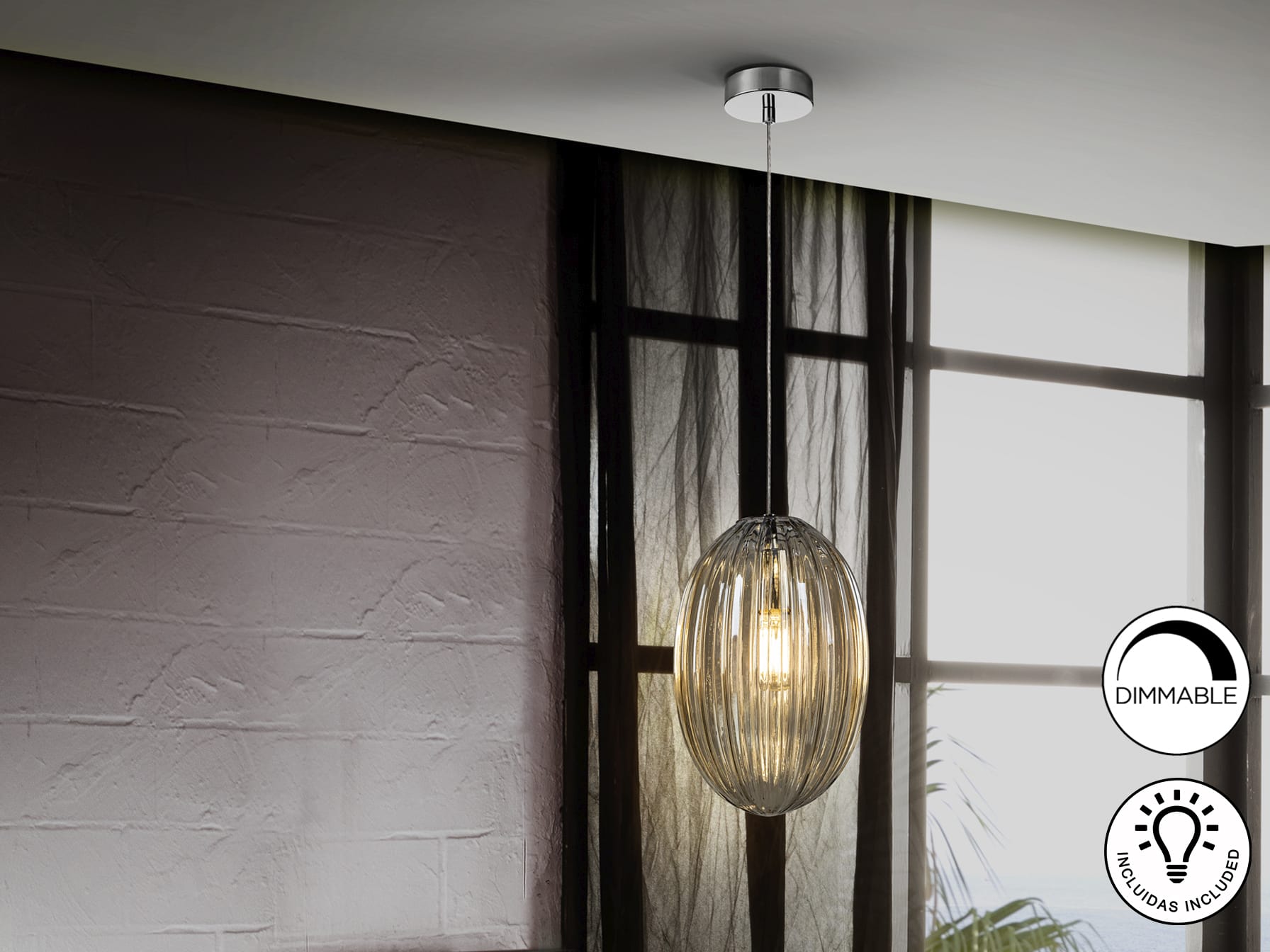 Lámpara de 1 luz , realizada en metal acabado cromo. Tulipa pequeña de cristal tono coñac. Regulable en altura.