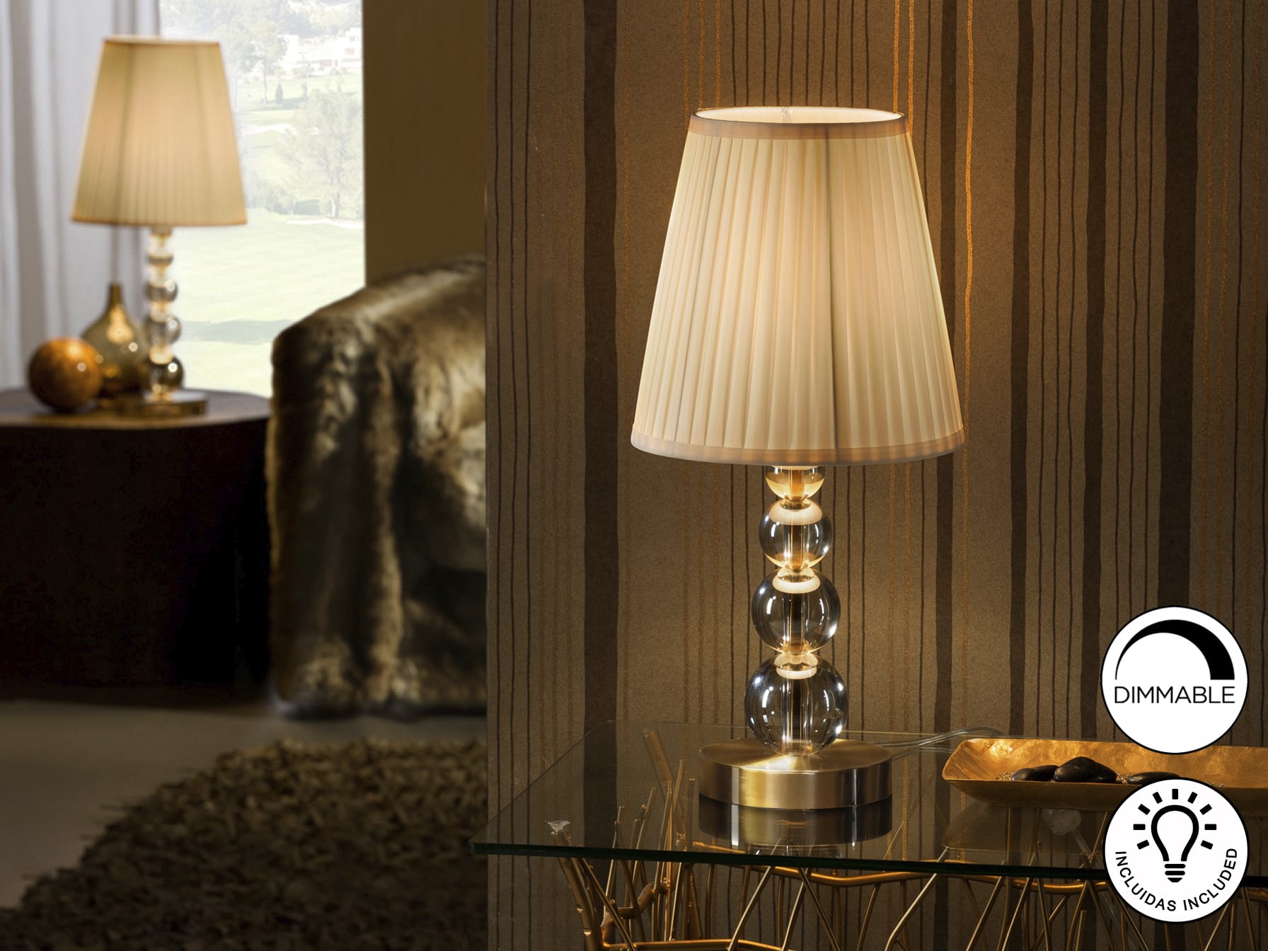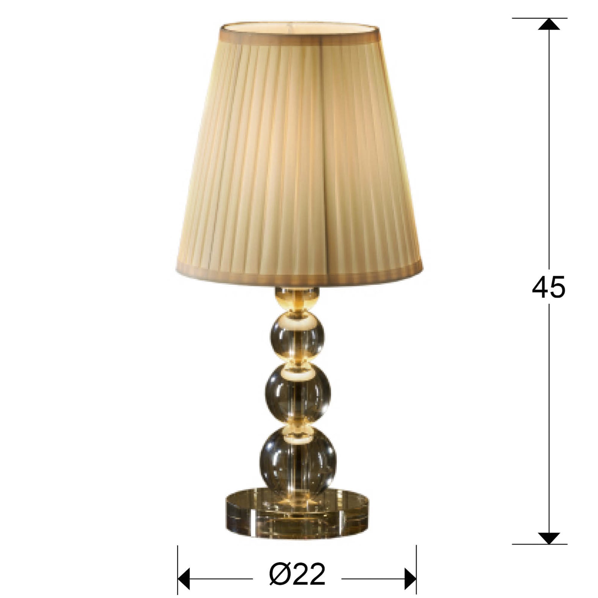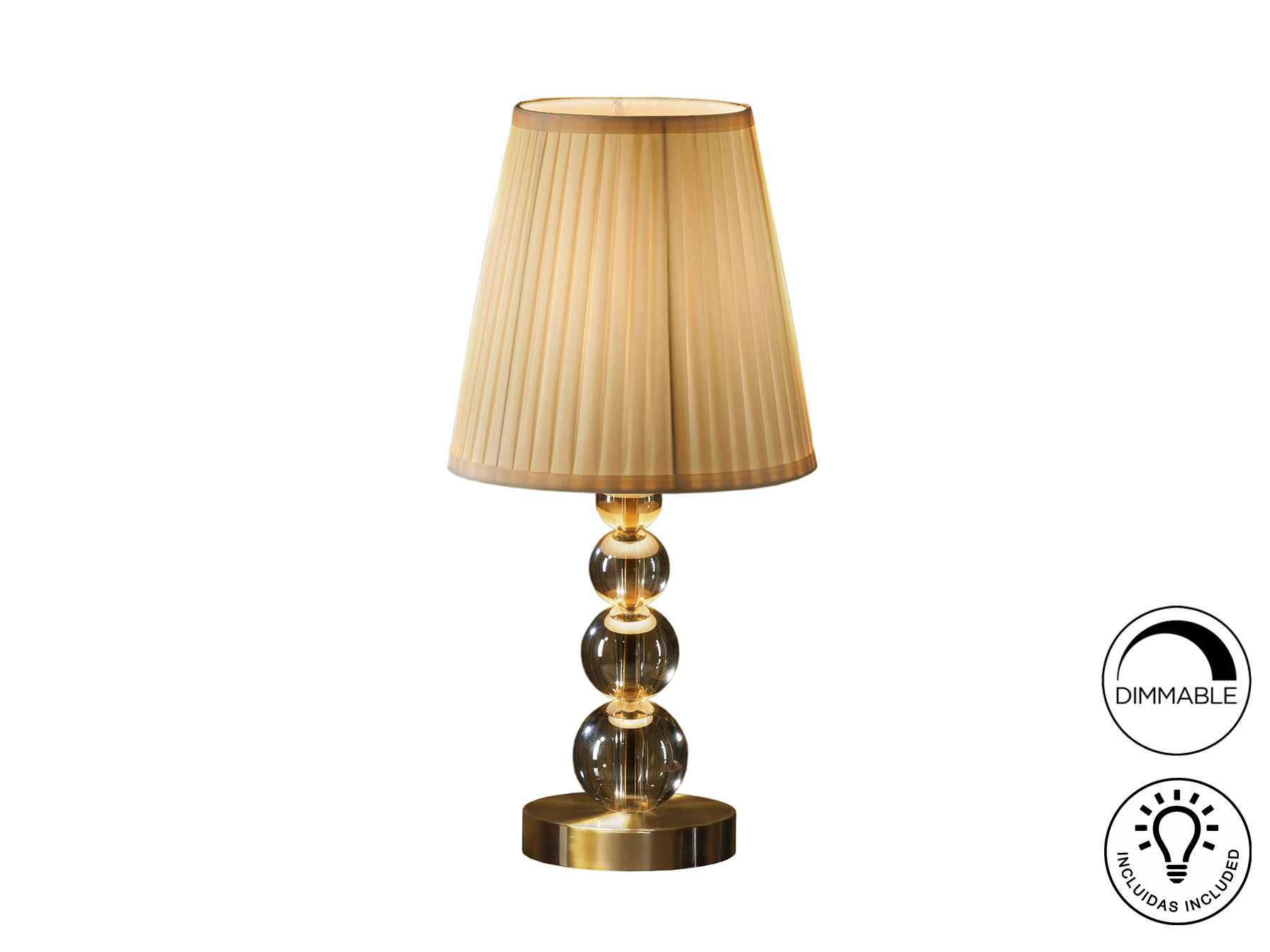 Sobremesa pequeño de 1 luz. Realizado en cristal de color champán, partes metalicas y base en acabado latón envejecido. Pantalla encintada de color beis.