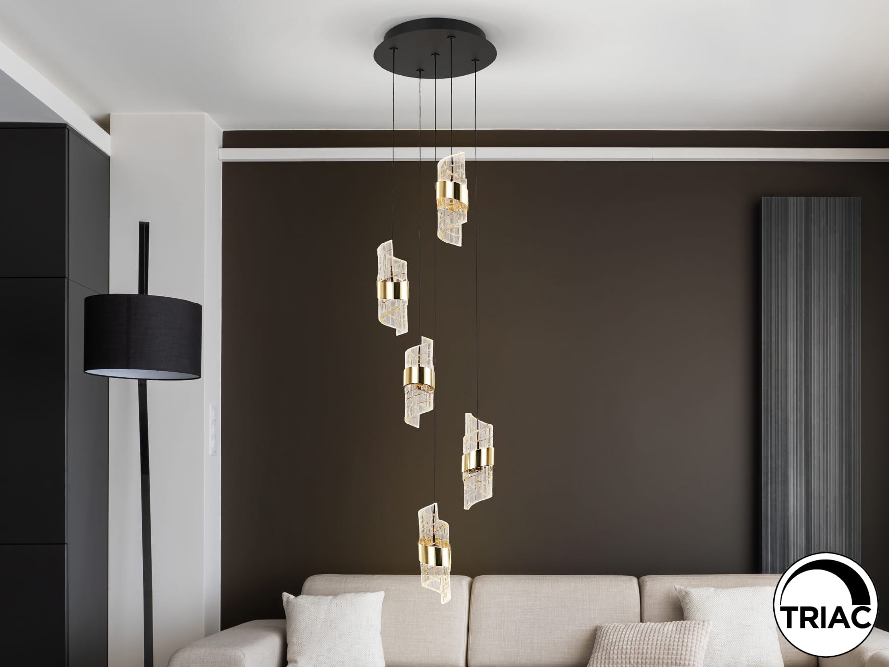 Lámpara de 5 luces LED. Realizada en metal acabado negro mate y oro brillo. Tulipas con diseño en espiral, realizadas en acrílico moldeado y tallado. Regulables en altura. 35W LED. 3.220 lm. 3.000 K. DIMABLE.