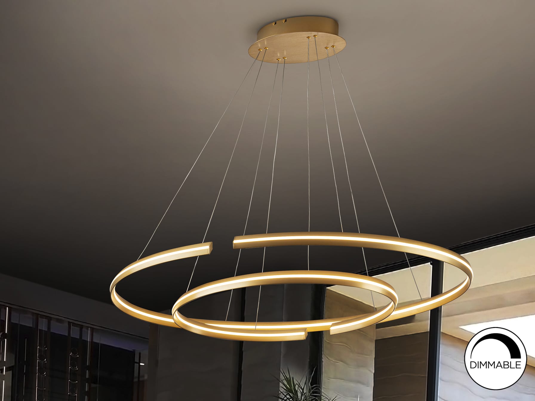 Lámpara de techo de luz LED, formada por dos elipses, realizada en metal y aluminio, acabado oro cepillado. Difusor acrílico opal. 100W LED, 4.144 lm, 3.000 K.DIMABLE, con control remoto y con APP.