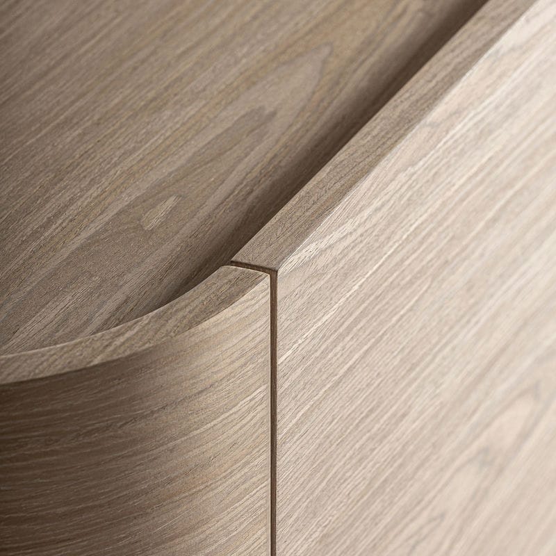 Su estructura combina un cuerpo alargado con dos bases circulares que refuerzan la estabilidad visual y aportan un carácter escultórico al conjunto. El diseño cerrado mantiene una imagen limpia y ordenada, convirtiendo el mueble en un elemento protagonista sin necesidad de recursos decorativos adicionales.
