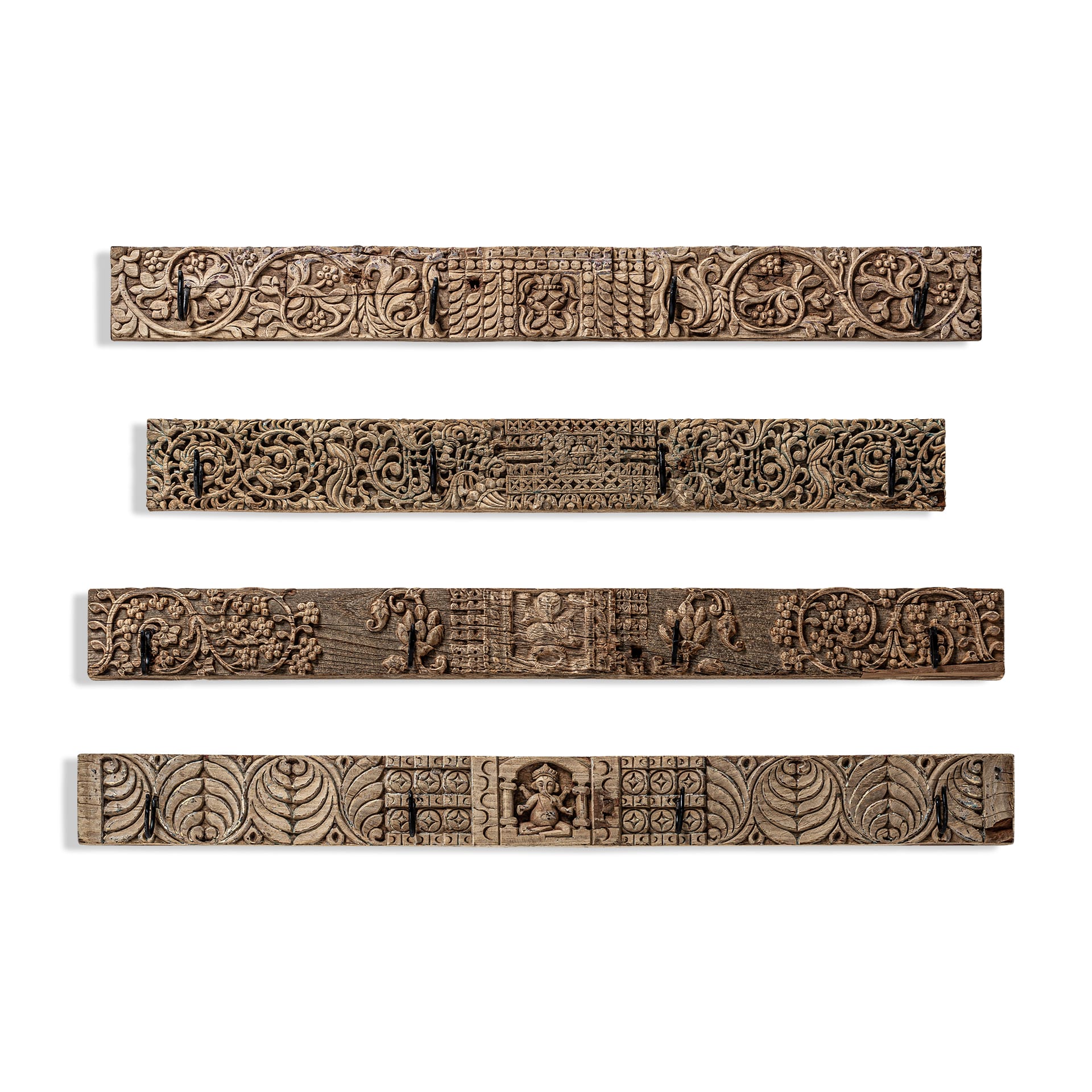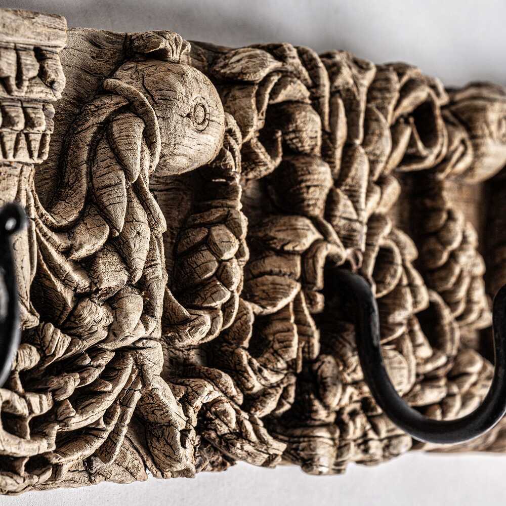 Percha Askale De Estilo étnico, Fabricado En Madera De Teka En Color Marrón Con Acabado Tallado, Combinado Con Hierro En Color Negro. Dimensiones: 100 x 12 x 12 cm