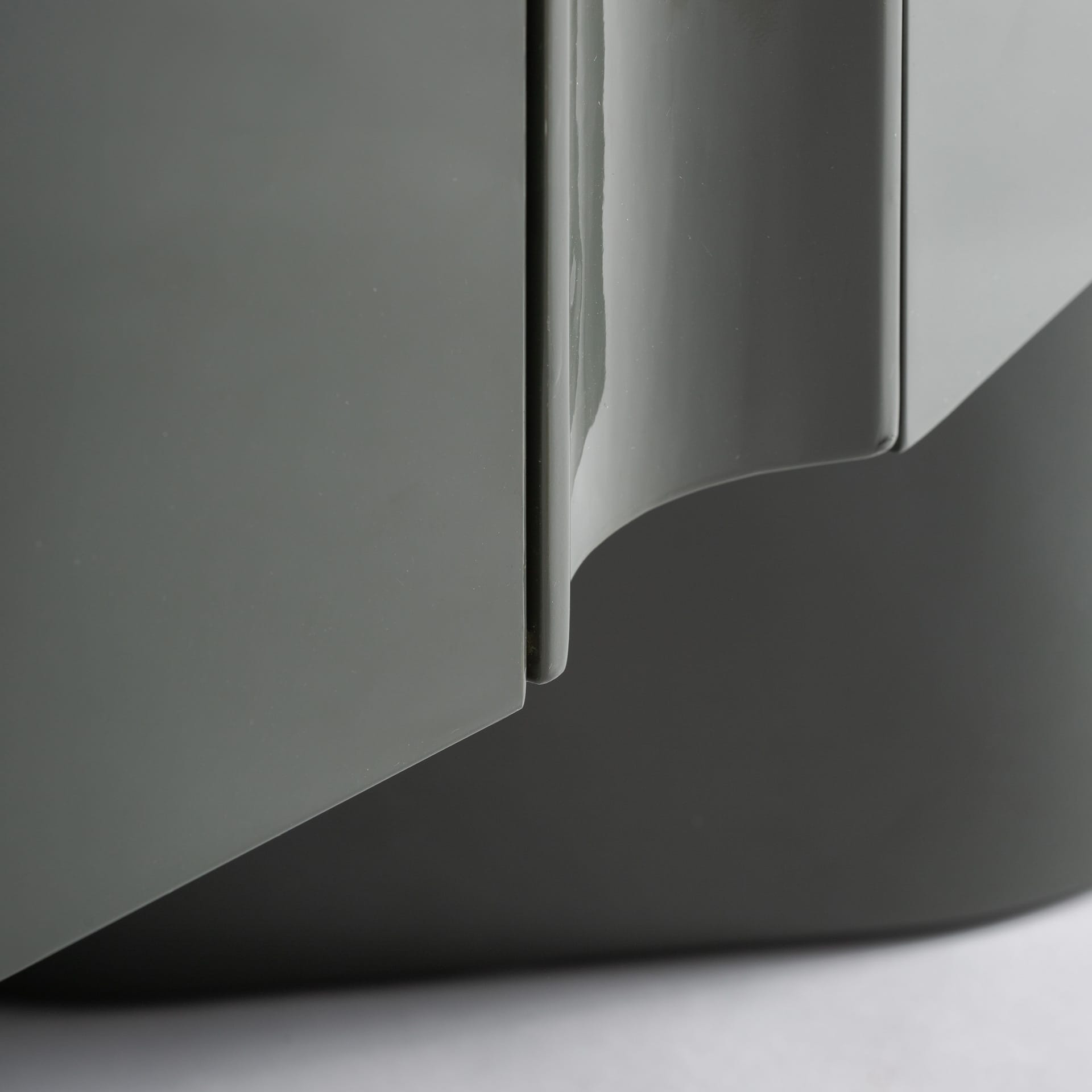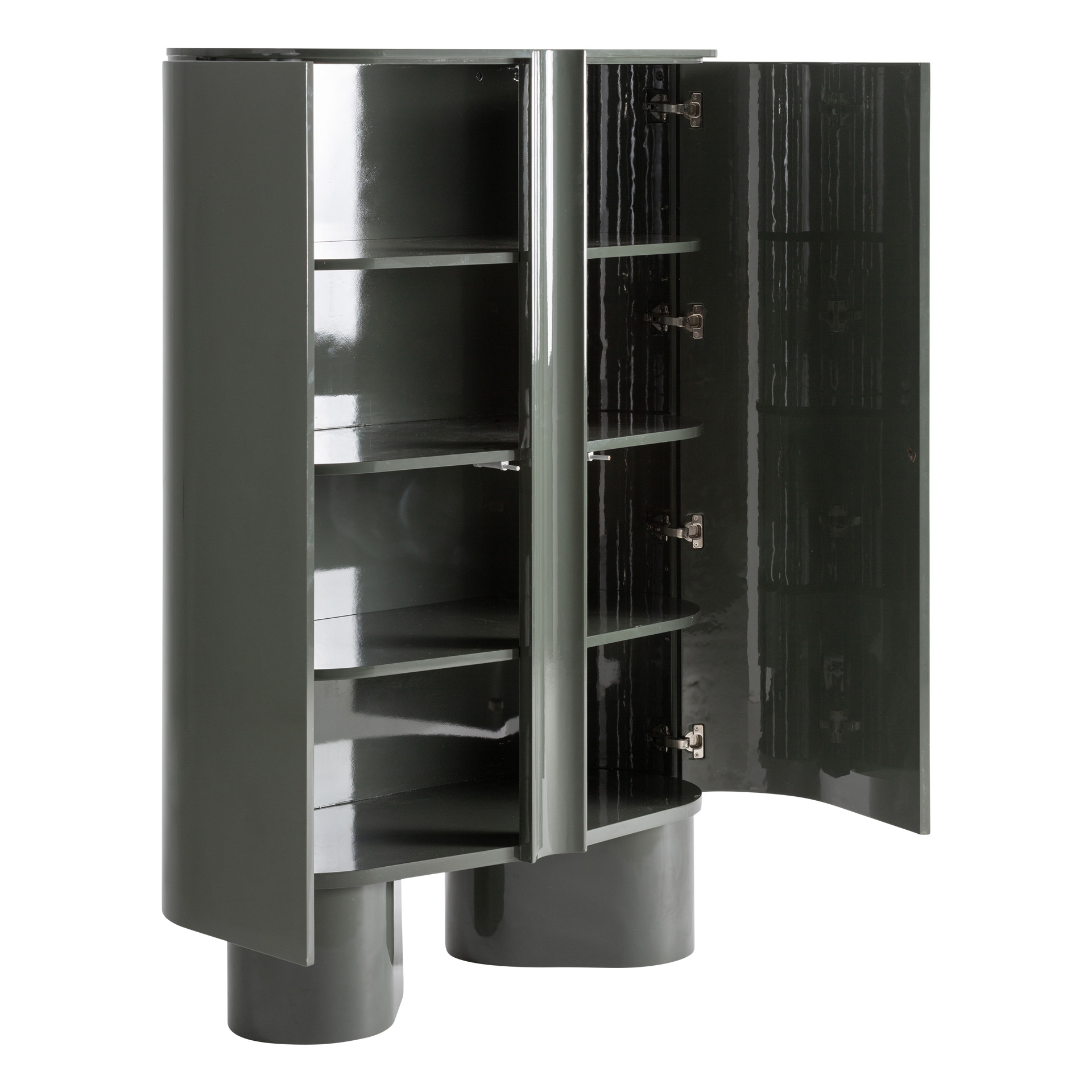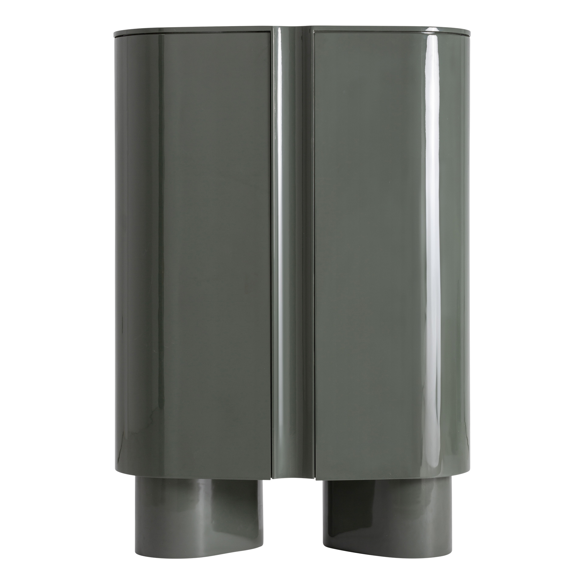 Este armario presenta un diseño compacto y vertical, con un volumen definido por superficies curvas y un acabado verde uniforme. La forma redondeada de las puertas suaviza la silueta y aporta una lectura visual continua, convirtiéndolo en una pieza con presencia propia.