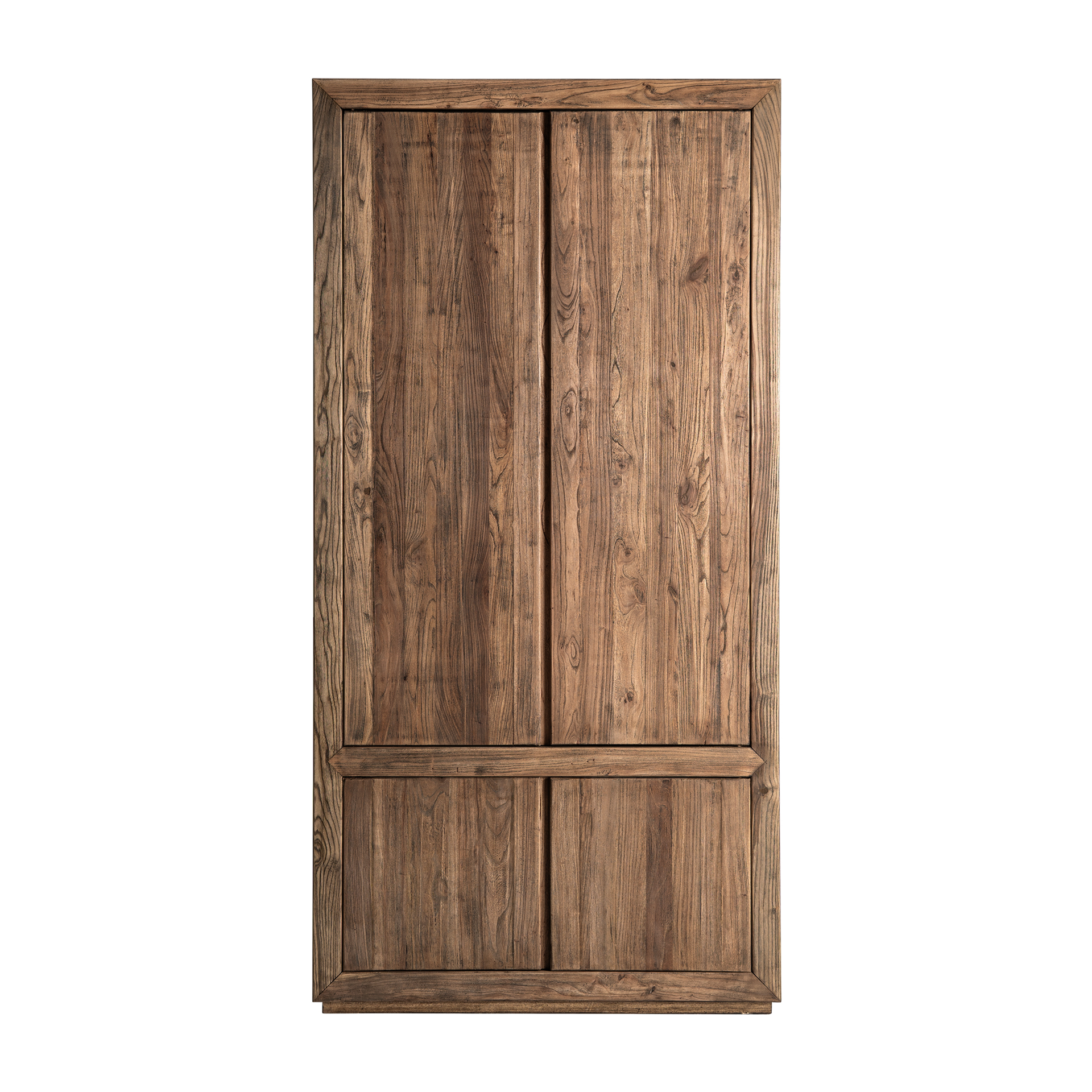 Este armario presenta una estructura alta y contundente, con un volumen bien definido que da protagonismo a la madera. El acabado marrón natural deja visibles las vetas y variaciones del olmo, aportando una lectura continua y orgánica a todo el conjunto.