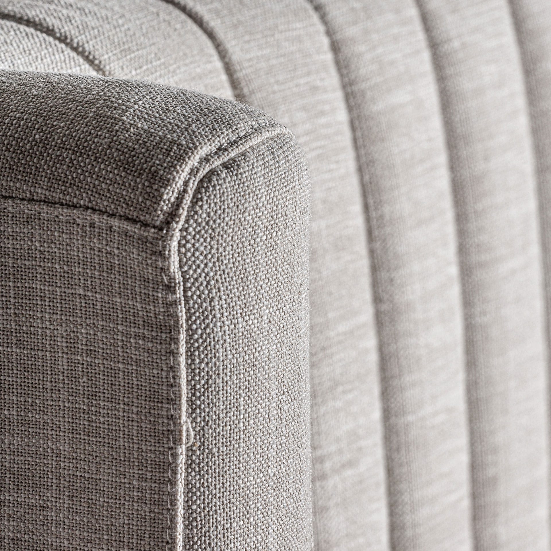 La Cama Aunac gris destaca por su cabecero alto tapizado con costuras verticales,