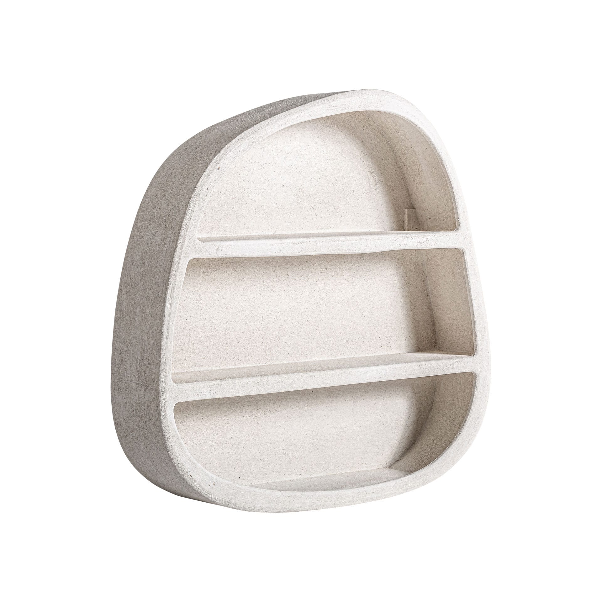 Su estructura incorpora tres compartimentos abiertos de líneas curvas, ideales para organizar libros, objetos decorativos o pequeñas piezas de colección. El acabado uniforme y las formas envolventes refuerzan su carácter minimalista y elegante.