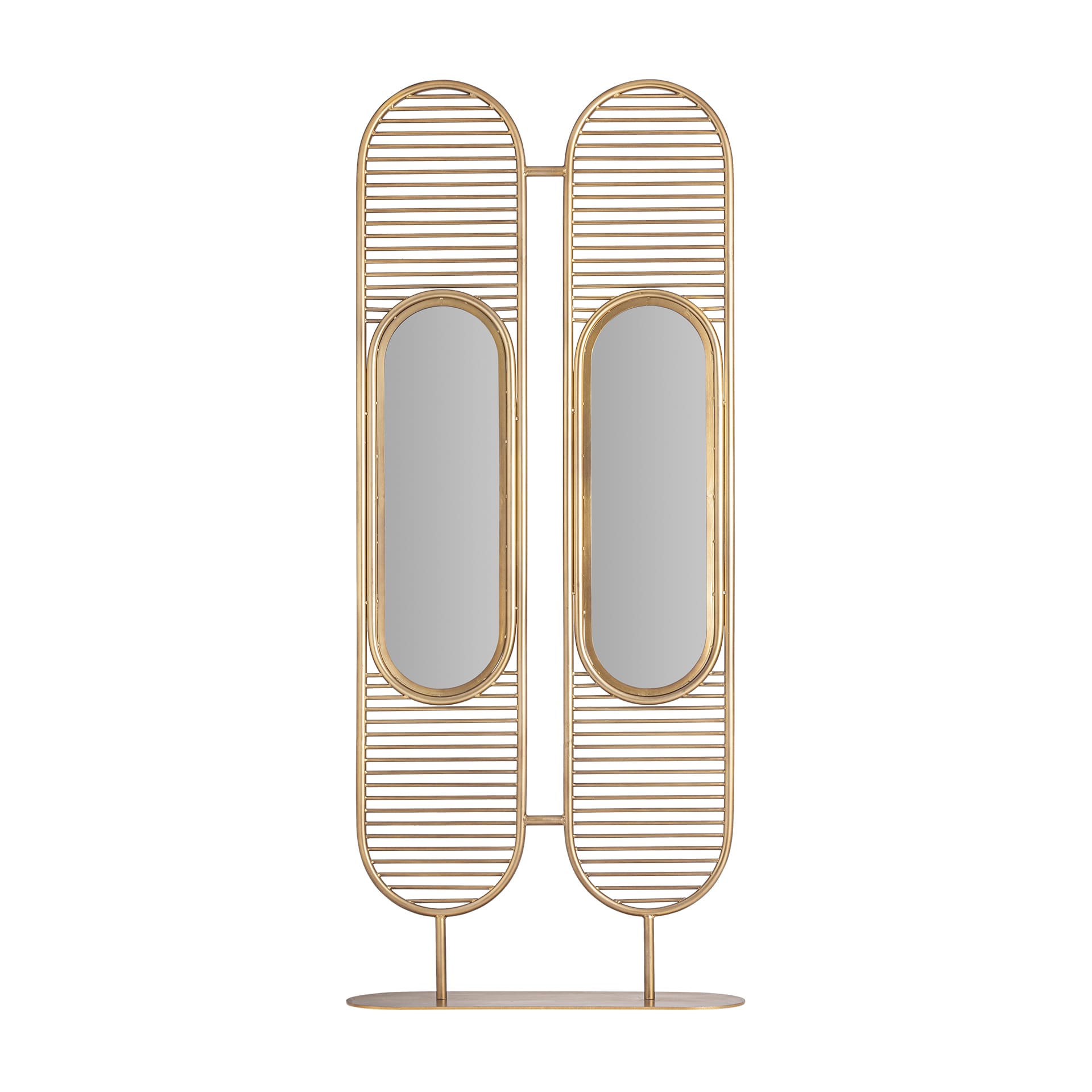 Su composición combina líneas rectas con formas ovaladas integradas a modo de espejo, aportando profundidad y dinamismo al conjunto. El formato alto permite dividir espacios de forma sutil, manteniendo la sensación de amplitud y aportando un toque decorativo refinado a salones, dormitorios o zonas de paso.