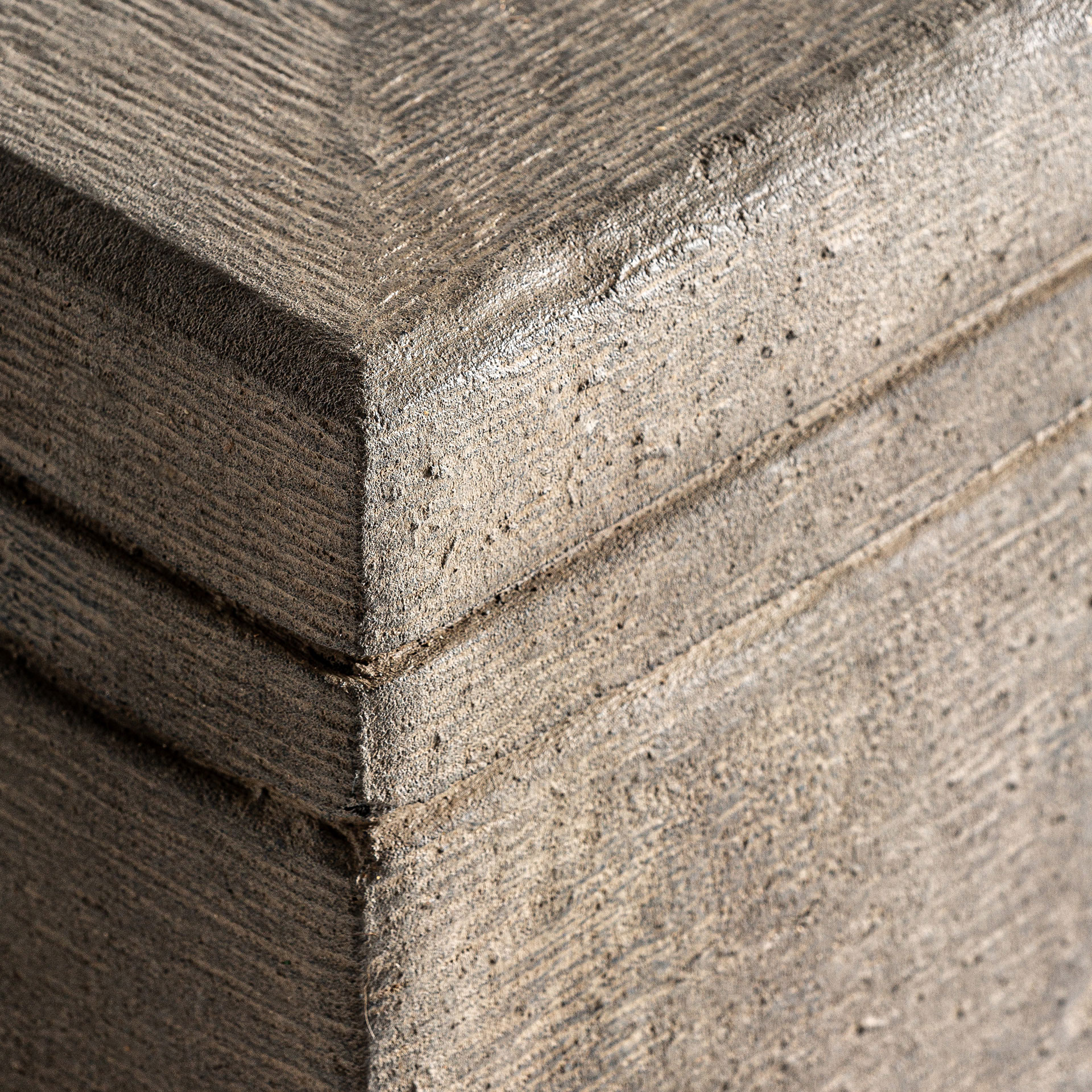 La Base Gela gris de cemento presenta un diseño sólido y sobrio, con una estética de inspiración arquitectónica que aporta carácter y presencia al espacio. Su acabado en tono gris resalta la textura del cemento, mostrando un aspecto natural y ligeramente rugoso que refuerza su identidad industrial.