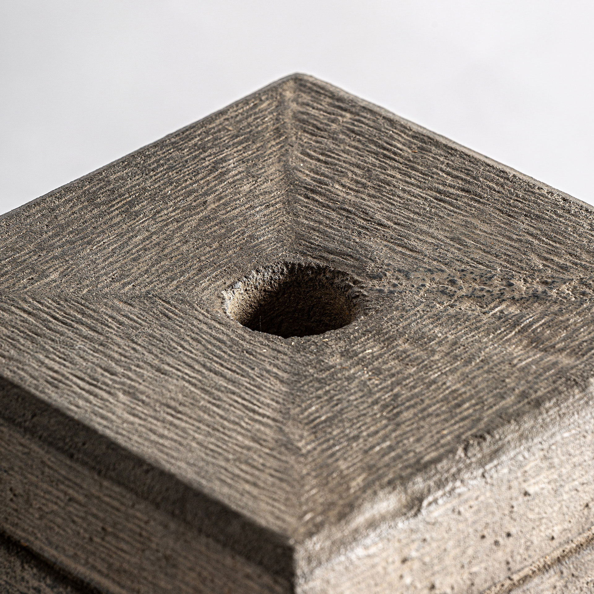 Su forma compacta y estable la convierte en una base funcional y decorativa, pensada para aportar soporte y equilibrio visual. El orificio superior integrado mantiene una línea limpia y definida, permitiendo su uso como elemento estructural sin alterar la armonía del conjunto.