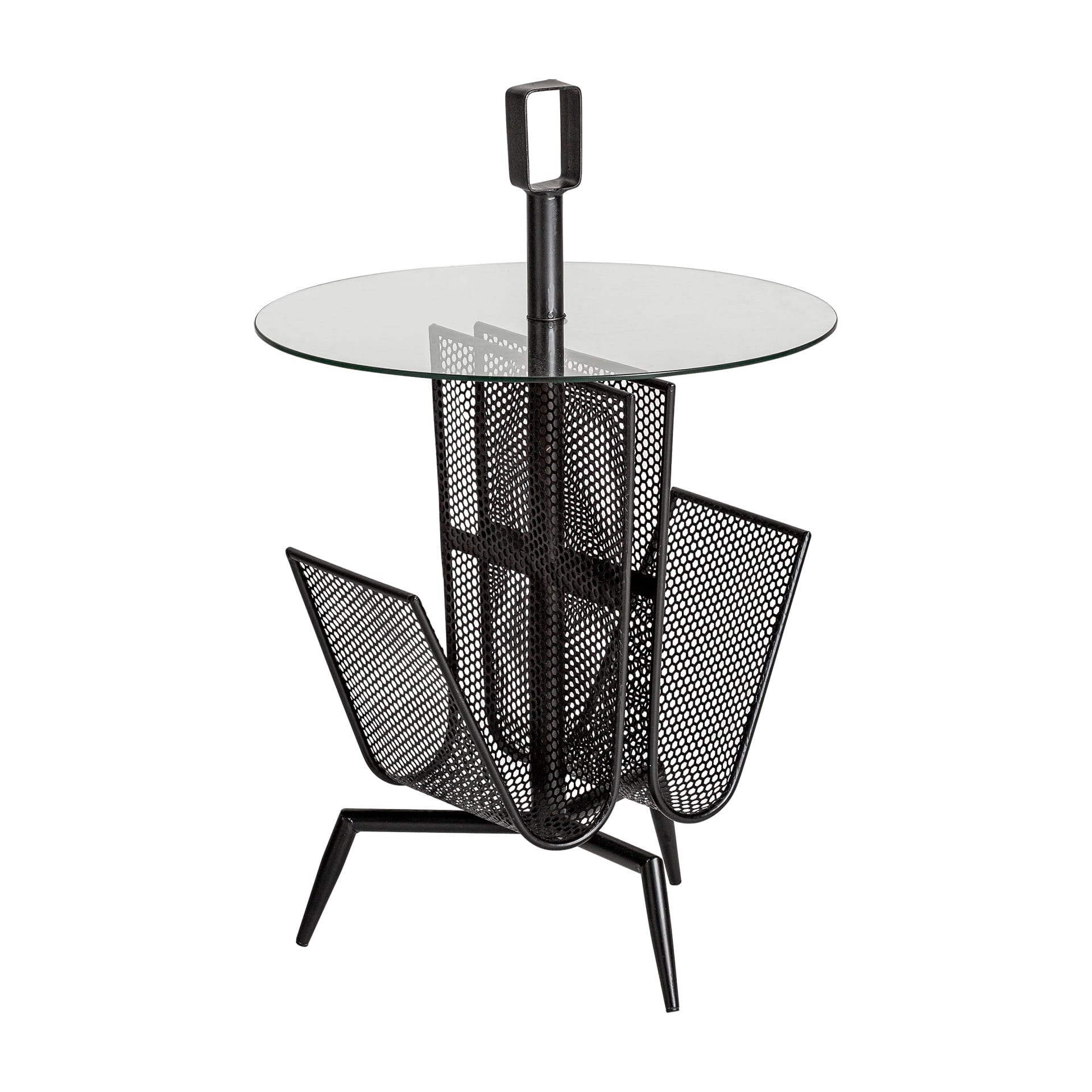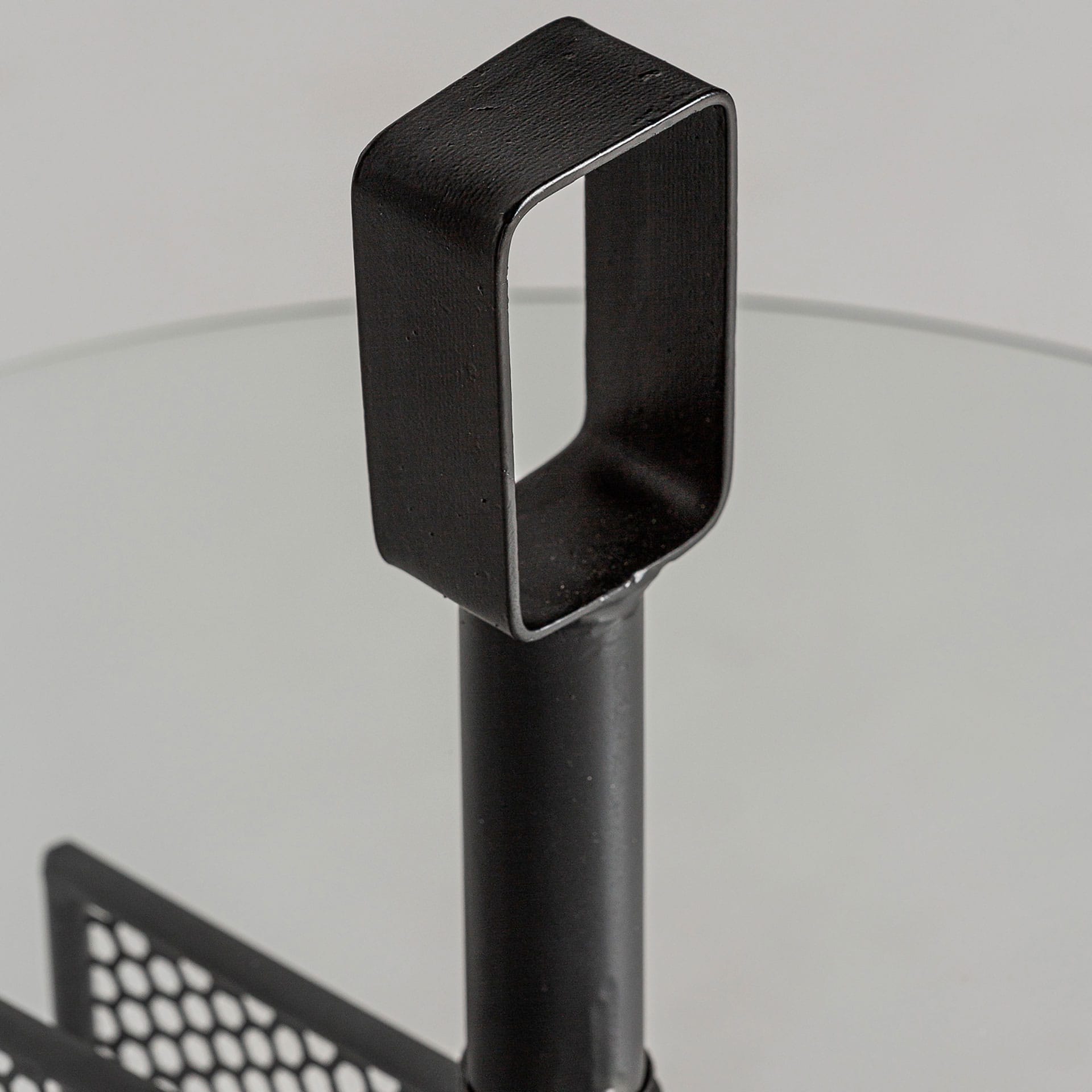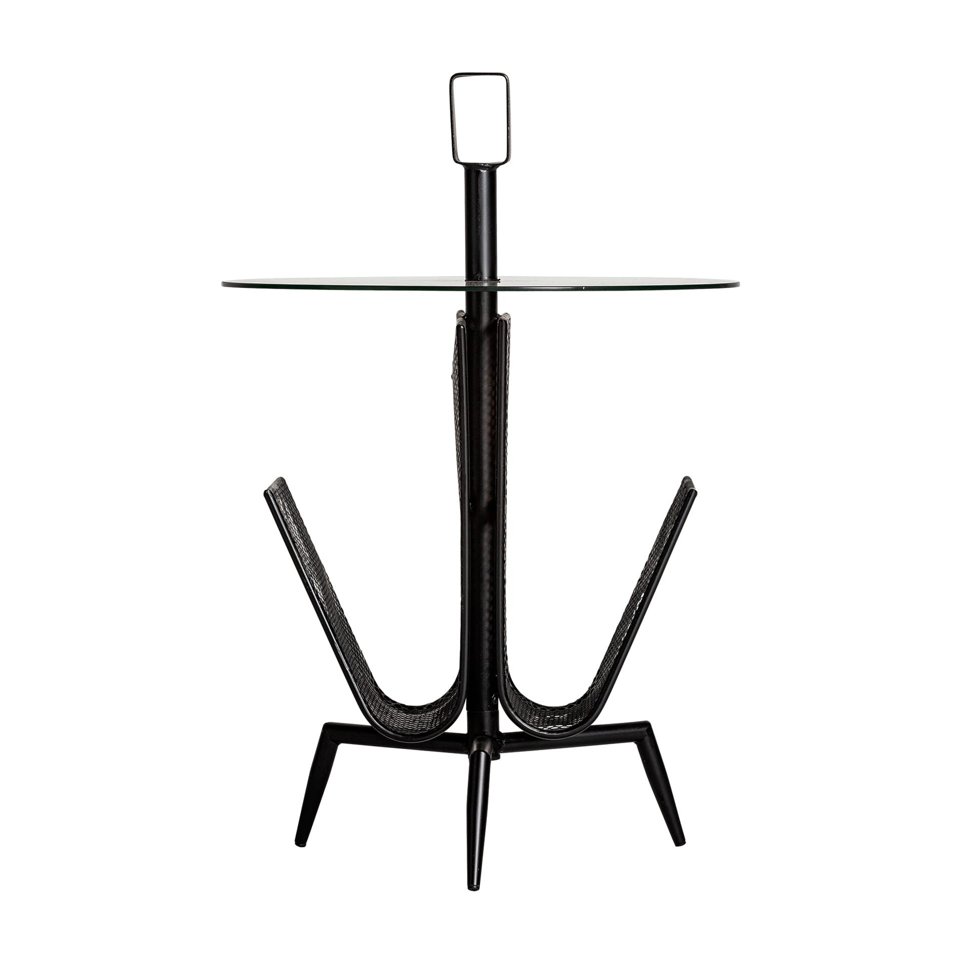 La Mesa Auxiliar Fussen es una mesa auxiliar con un diseño muy práctico y decorativo a la vez. Su estructura de hierro negro incorpora compartimentos tipo revistero, perfectos para organizar revistas, libros o mantas finas, mientras que el sobre redondo de cristal aporta ligereza visual.