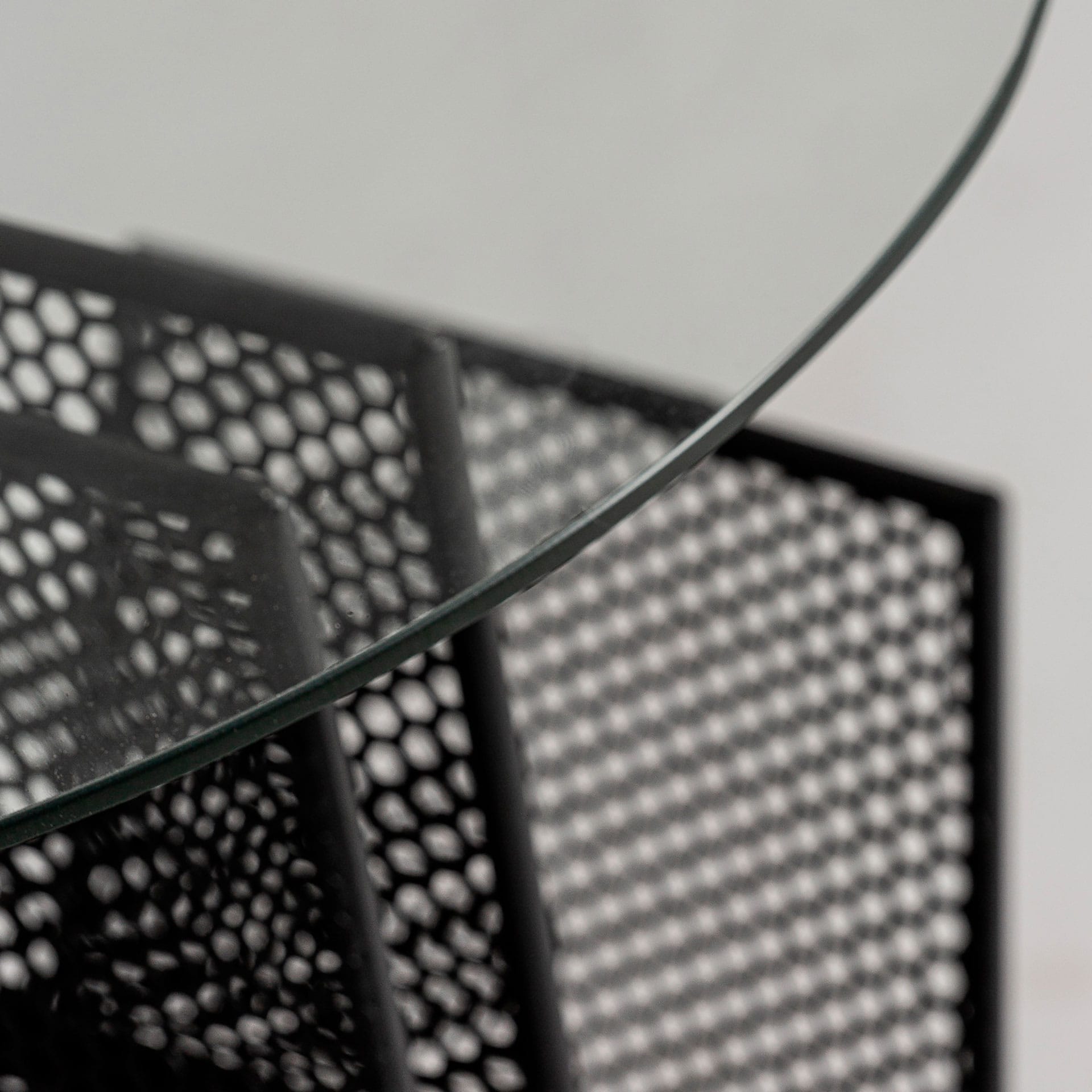 El contraste entre el cristal y el metal crea un conjunto equilibrado: el cristal deja ver la estructura, y la malla organiza sin necesidad de añadir más muebles auxiliares.