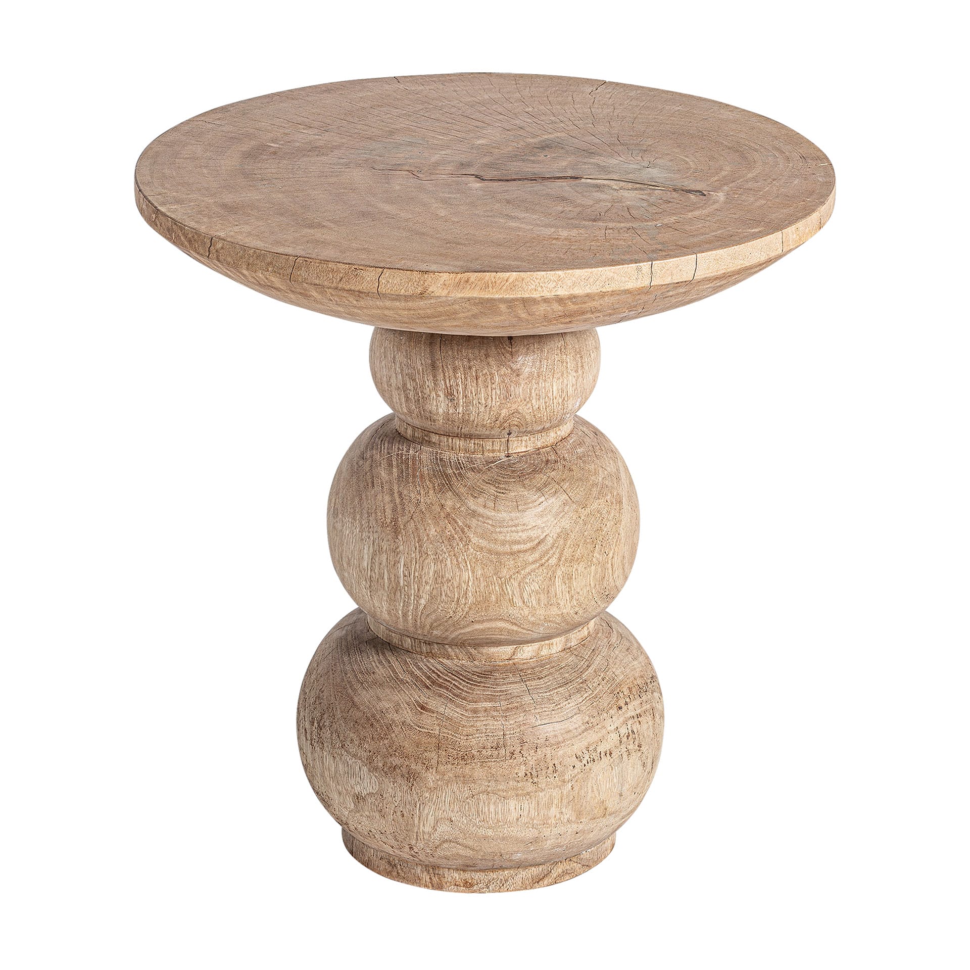 - Diseño: mesa redonda tipo pedestal con base torneada de volúmenes apilados