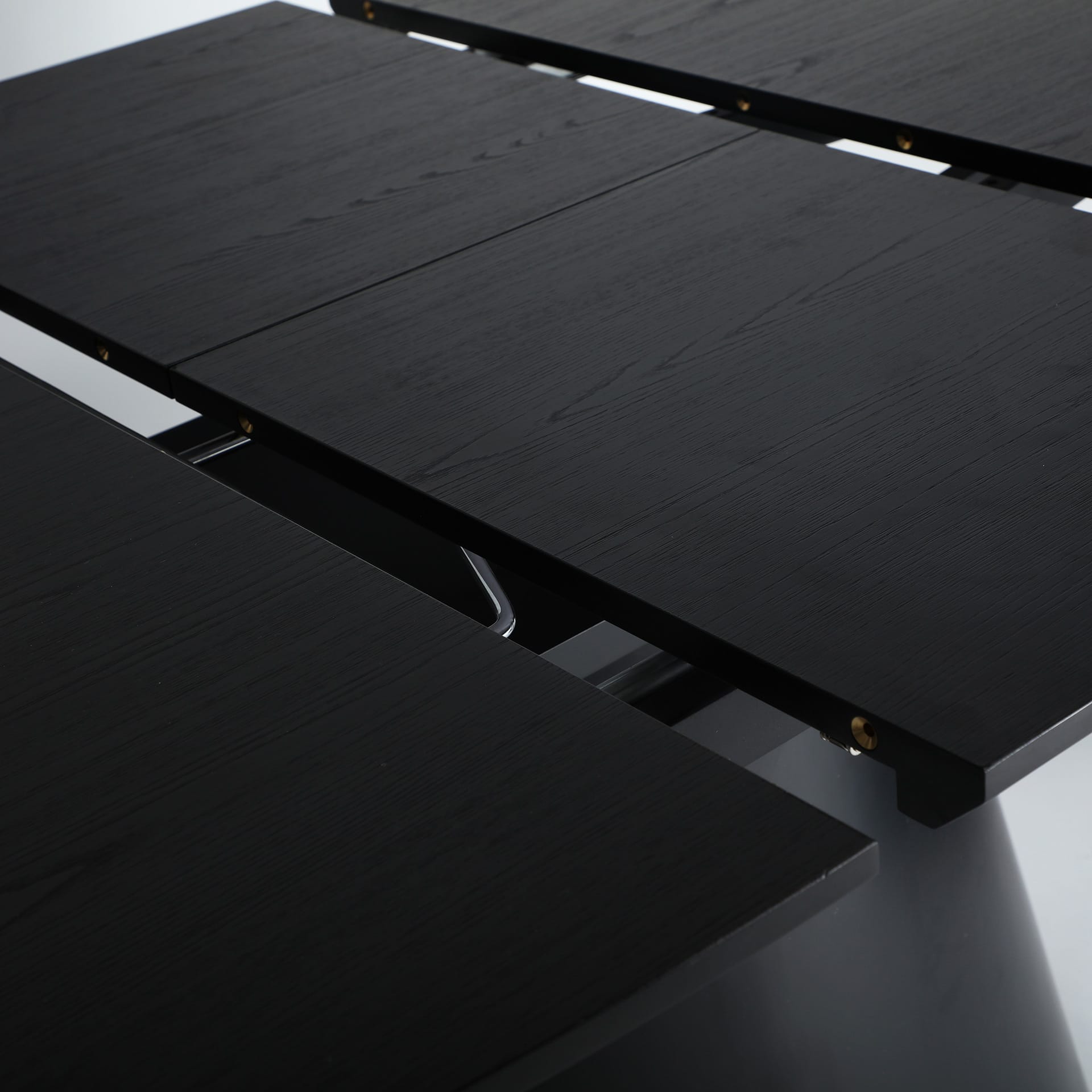 El acabado negro aporta un look sofisticado y contemporáneo, y la base tipo pedestal cónico mantiene una estética limpia, dejando más libertad para colocar sillas cómodamente.