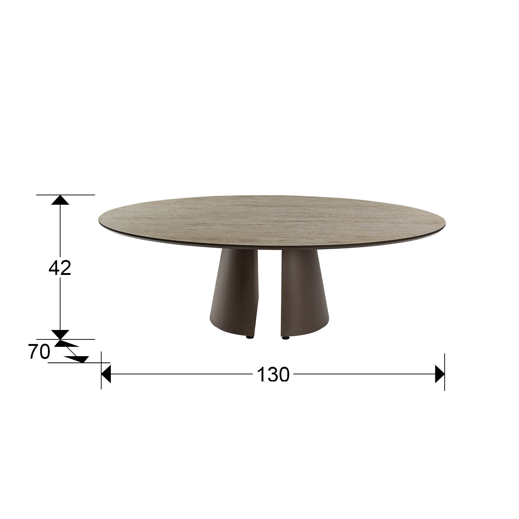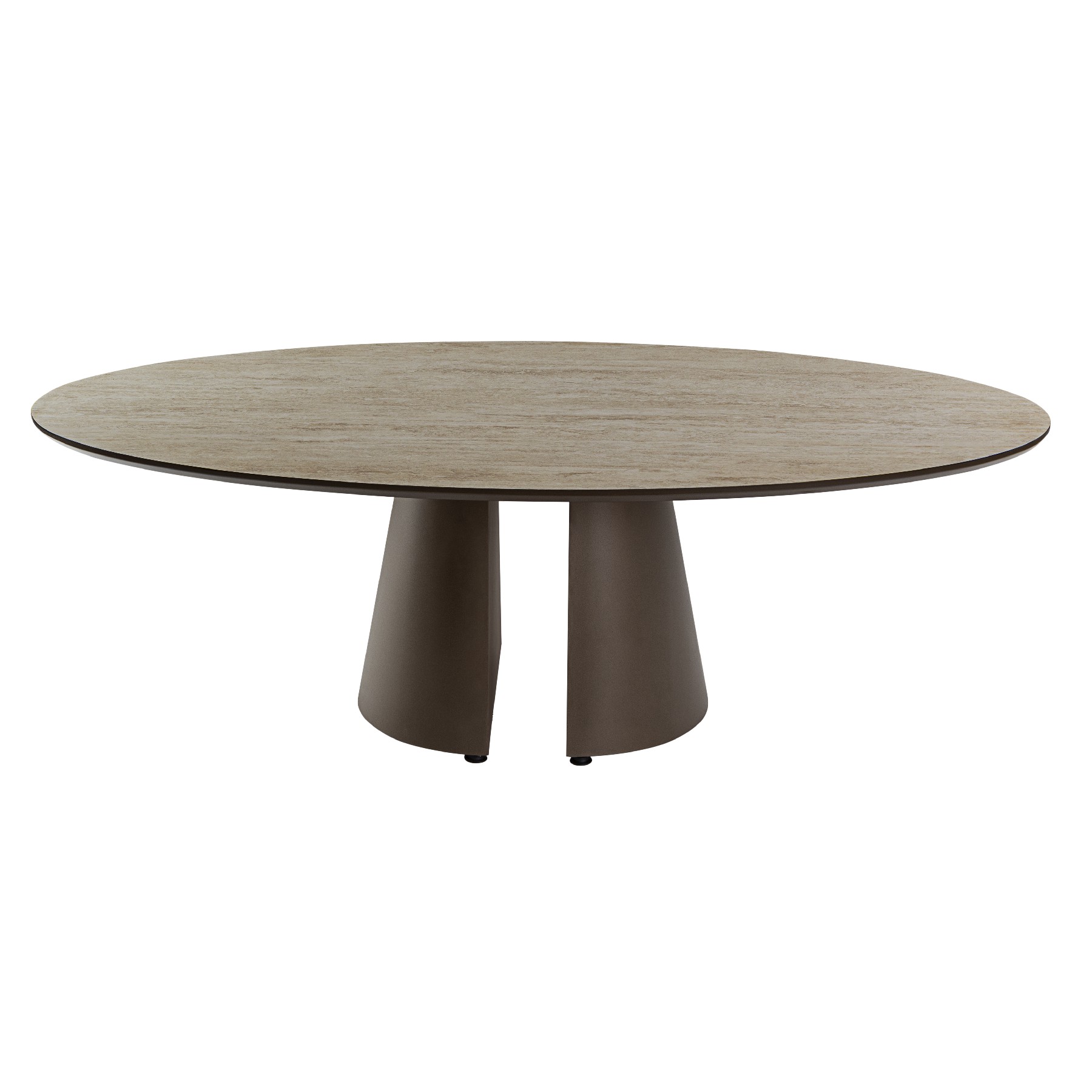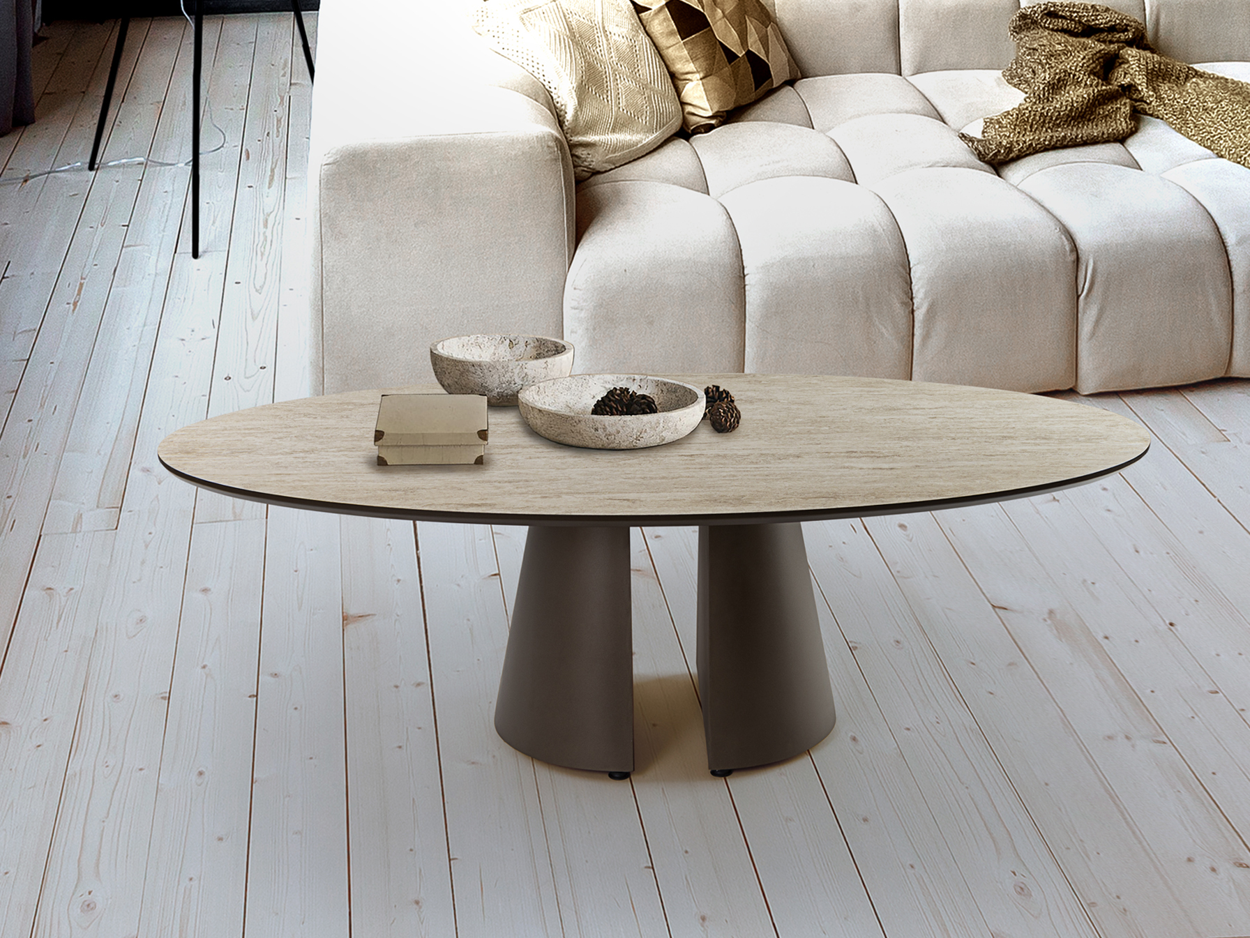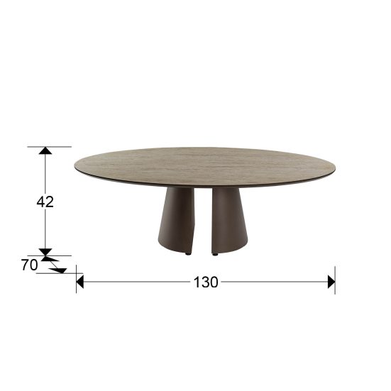 Mesa de centro ovalada, estructura realizada en metal y MDF acabado marrón óxido. Tapa de MDF con superficie melaminica de alta resistencia, acabado travertino, con cantos en marrón óxido.