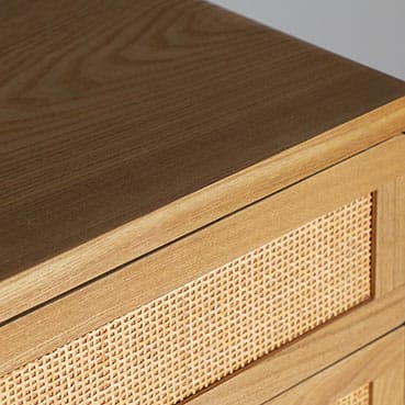 El acabado en madera de abeto en tono marrón claro transmite calidez y una estética natural, mientras que los frentes con detalle de rejilla aportan textura y un toque artesanal que enriquece el conjunto. La elevación sobre patas vistas refuerza una sensación de ligereza y orden visual.