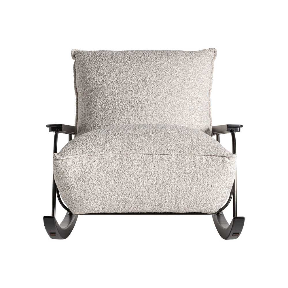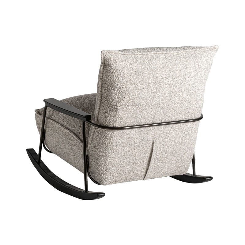 La mecedora Zwalm reinterpreta el clásico con líneas limpias y actuales. Su asiento tapizado en beige jaspeado