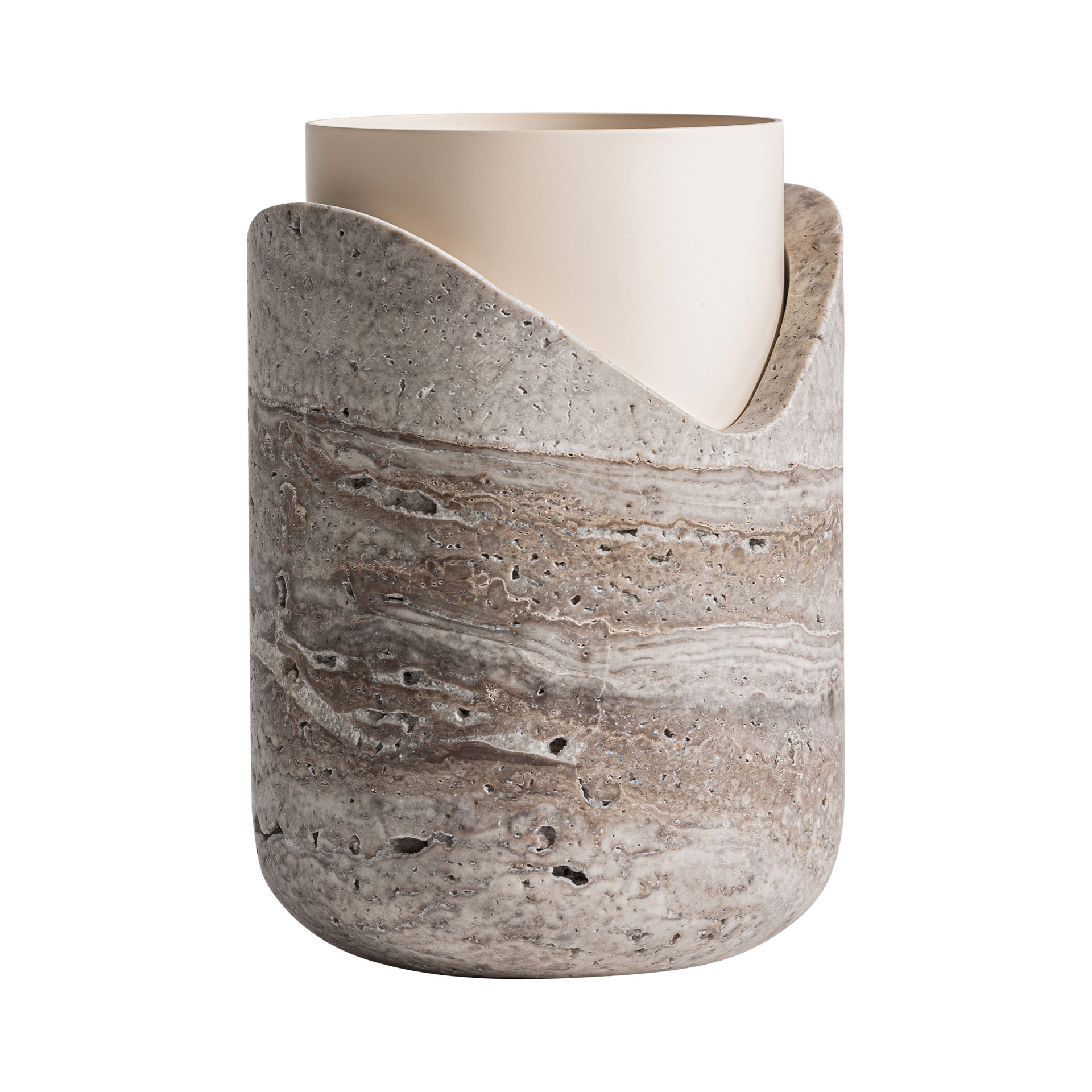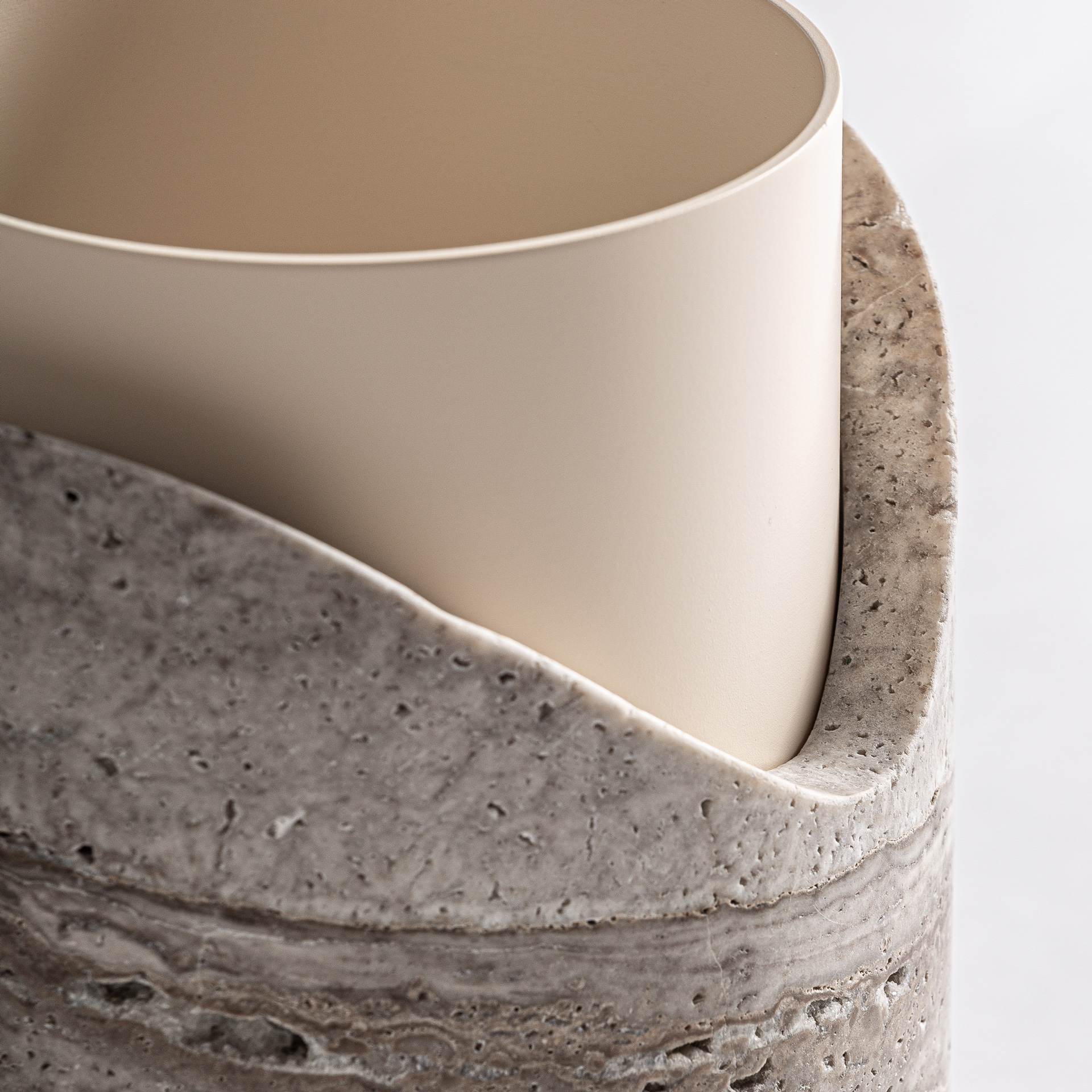 El Jarrón Daye de VICAL combina la fuerza del mármol beige con la suavidad de sus líneas orgánicas. Su diseño escultórico realzado por un detalle superior en acero crema lo convierte en un elemento decorativo con carácter propio. Una pieza que aporta sofisticación y autenticidad en ambientes profesionales. Producto desmontable.