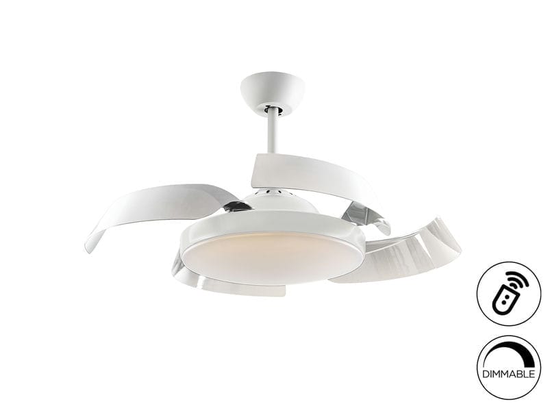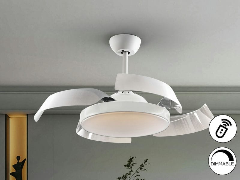 Ventilador de techo con luz LED DIMABLE CCT, hecho en metal acabado blanco mate y aspas retráctiles de acrílico blanco. Difusor acrílico opal. Motor DC: 6 velocidades e inversión. 3 tonos de luz. Temporizador. control remoto.